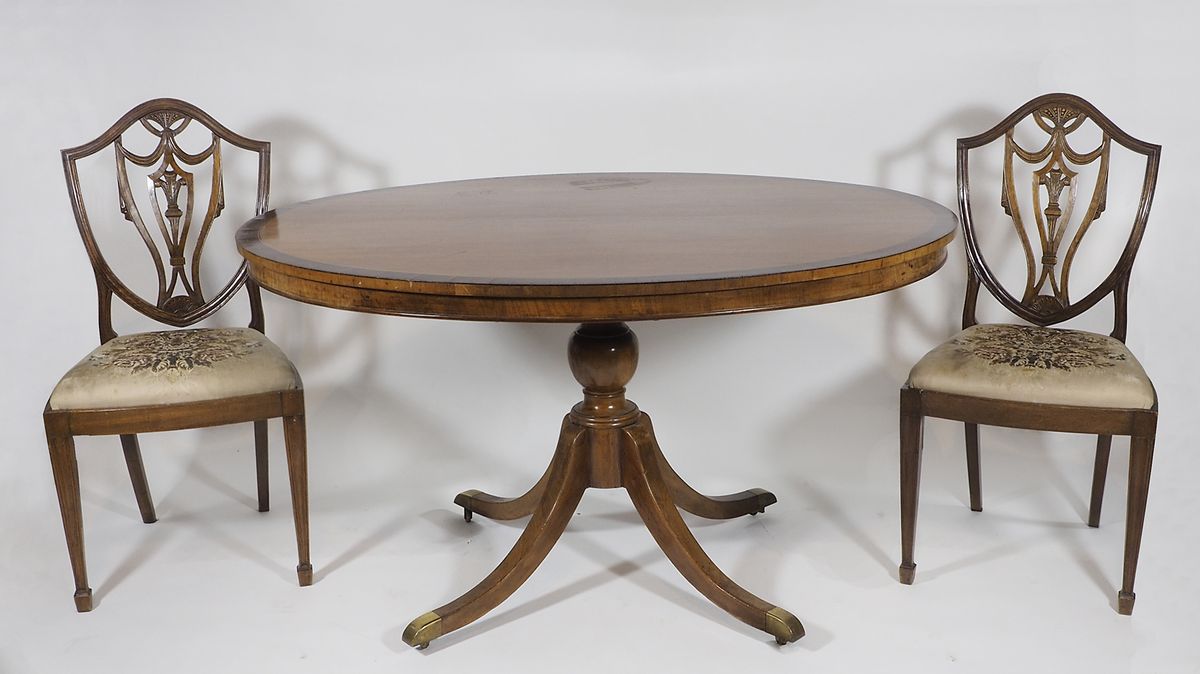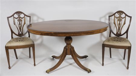 Tavolo ovale con intarsi e 6 sedie inglesi.