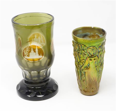 Lotto di 2 bicchieri: in cristallo con paesaggi e uno Zsolnay. H. max cm. 19....