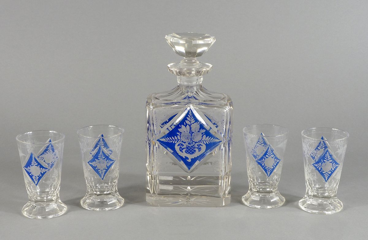 Lotto in cristallo trasparente e blu composto da bottiglia e 4 bicchieri.