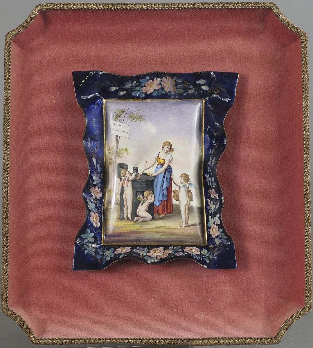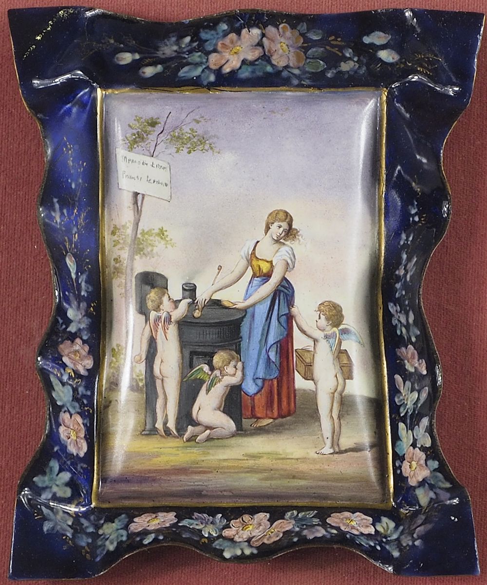 Piastra interamente decorata a smalti policromi raffigurante angeli e donna. cm. 14,5x12. Incorniciata.