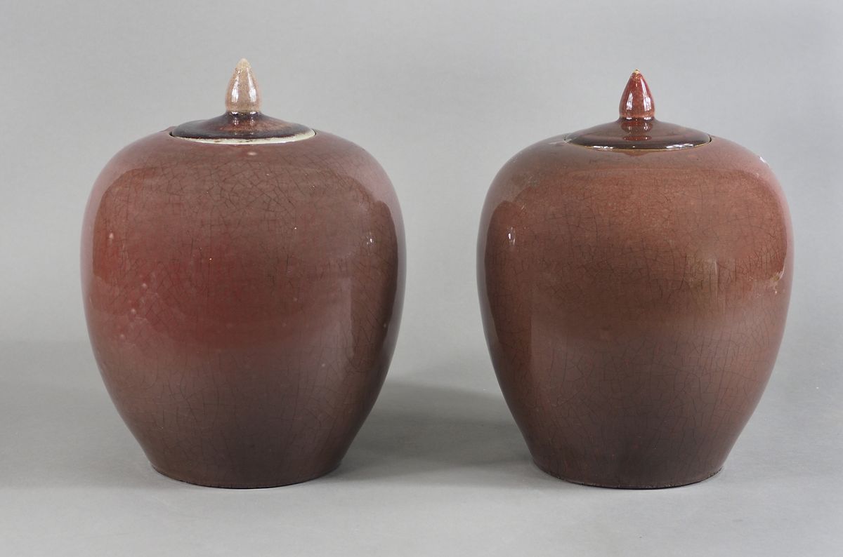 Coppia di vasi orientali a boccia con coperchi. H. cm. 26.