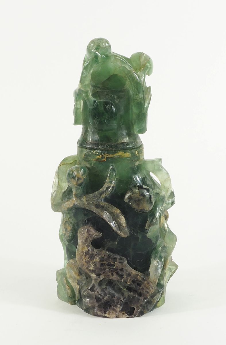 Vaso in giada finemente scolpito con figure di animali, con coperchio. H. cm. 31. (difetti).