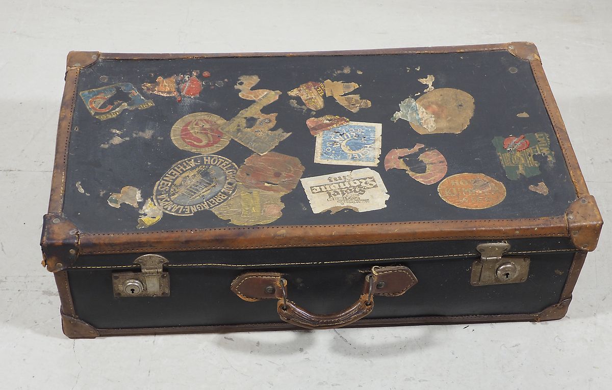 Valigia da viaggio decorata con vecchie etichette di alberghi italiani.