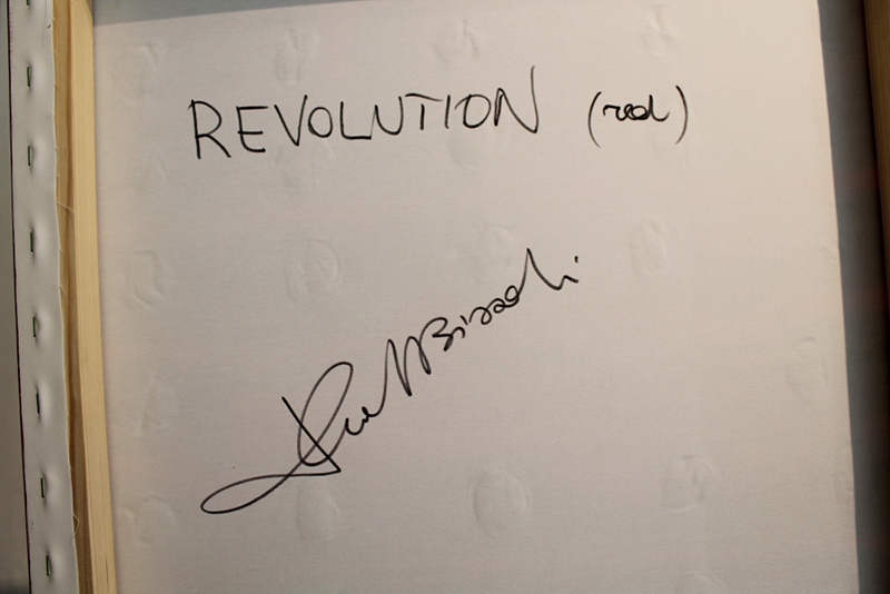Opera materica - colore acrilico rosso e bianco fosforescente con applicazione di banconote americane da 1 USD