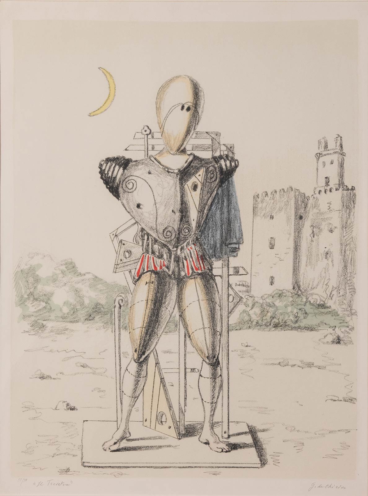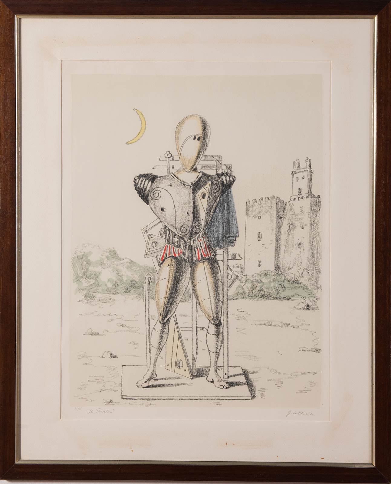 Litografia a colori su carta, firmata in basso a destra G. De Chirico, titolo e numero di tiratura in basso a sinistra 55/90 ‘Il Trovatore’, Lastra H cm 60x45 Al retro timbro della Galleria Merescalchi – Bologna, con sigla MM-Mario Marescalchi ed etichetta Alberto Schubert Editore – Milano