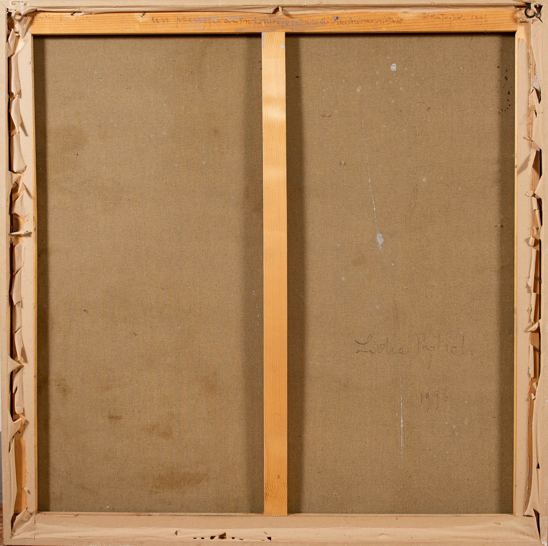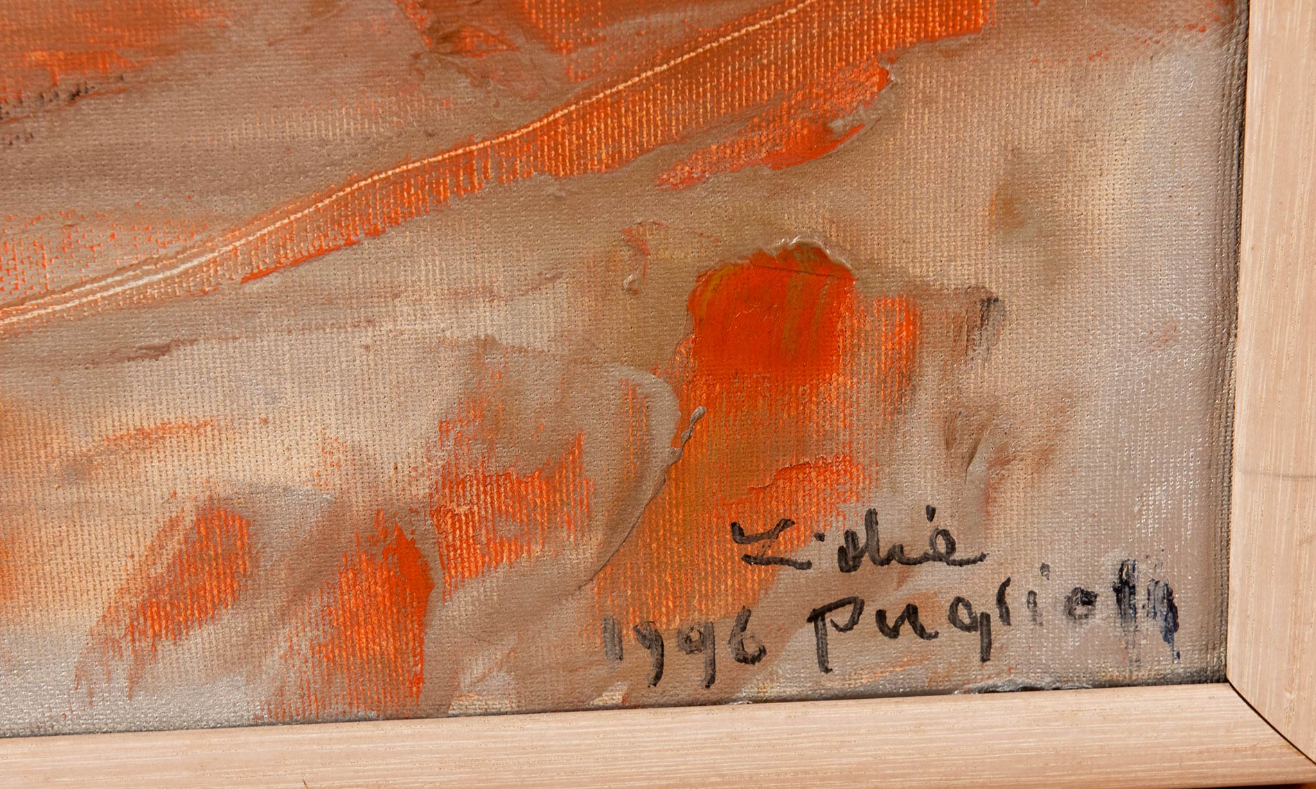 Olio su tela, firmato e datato in basso a destra Lidia Puglioli 1996, al retro data e firma e sul telaio titolo, firma e data sul telaio ‘Un paesaggio antropomorfo intriso di misticismo cristiano - Lidia Puglioli 1996', H cm 100 x100