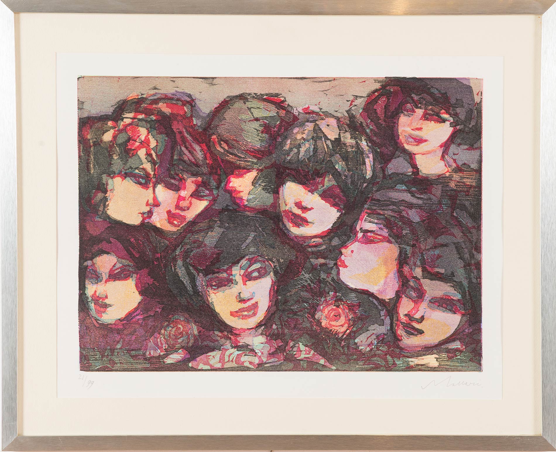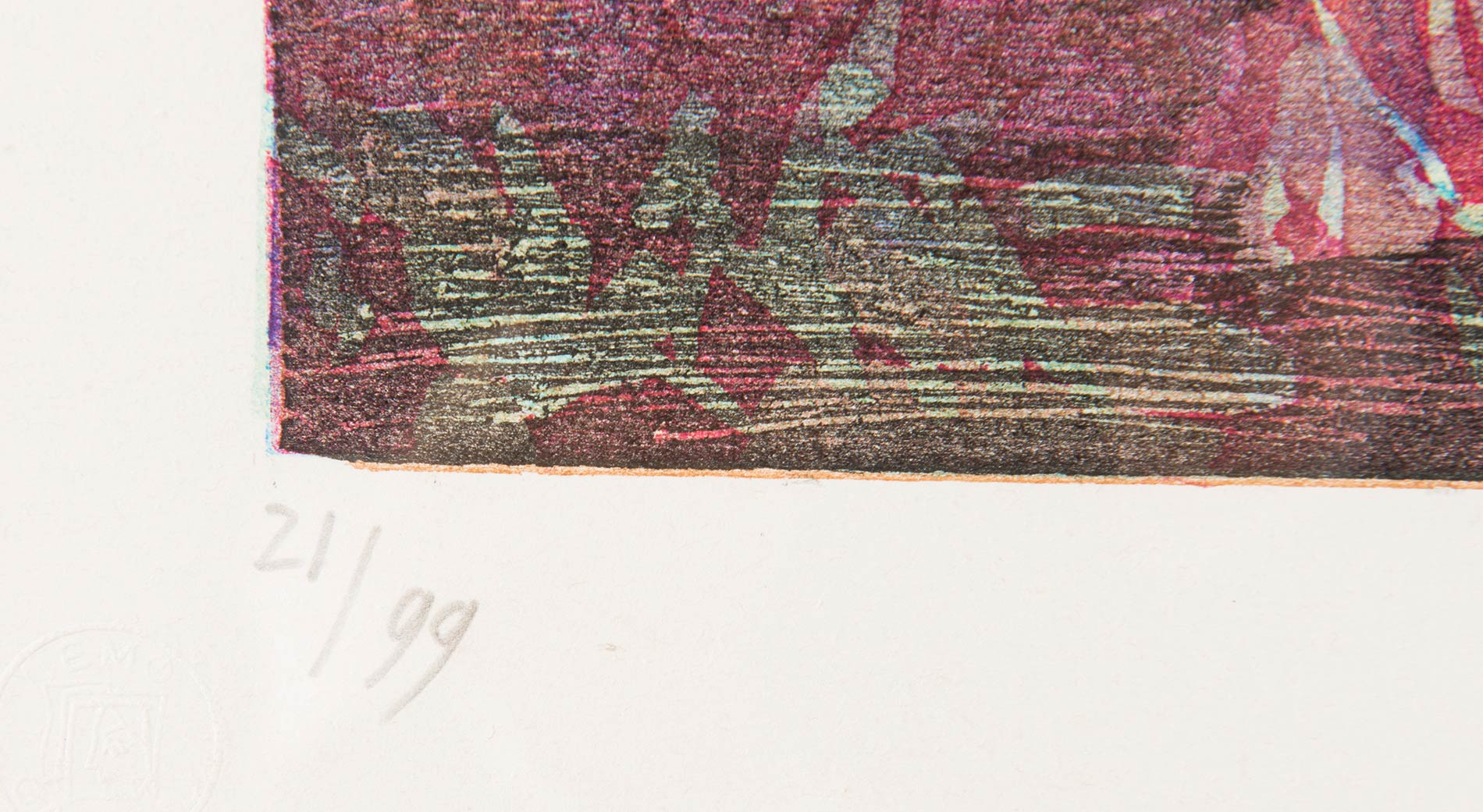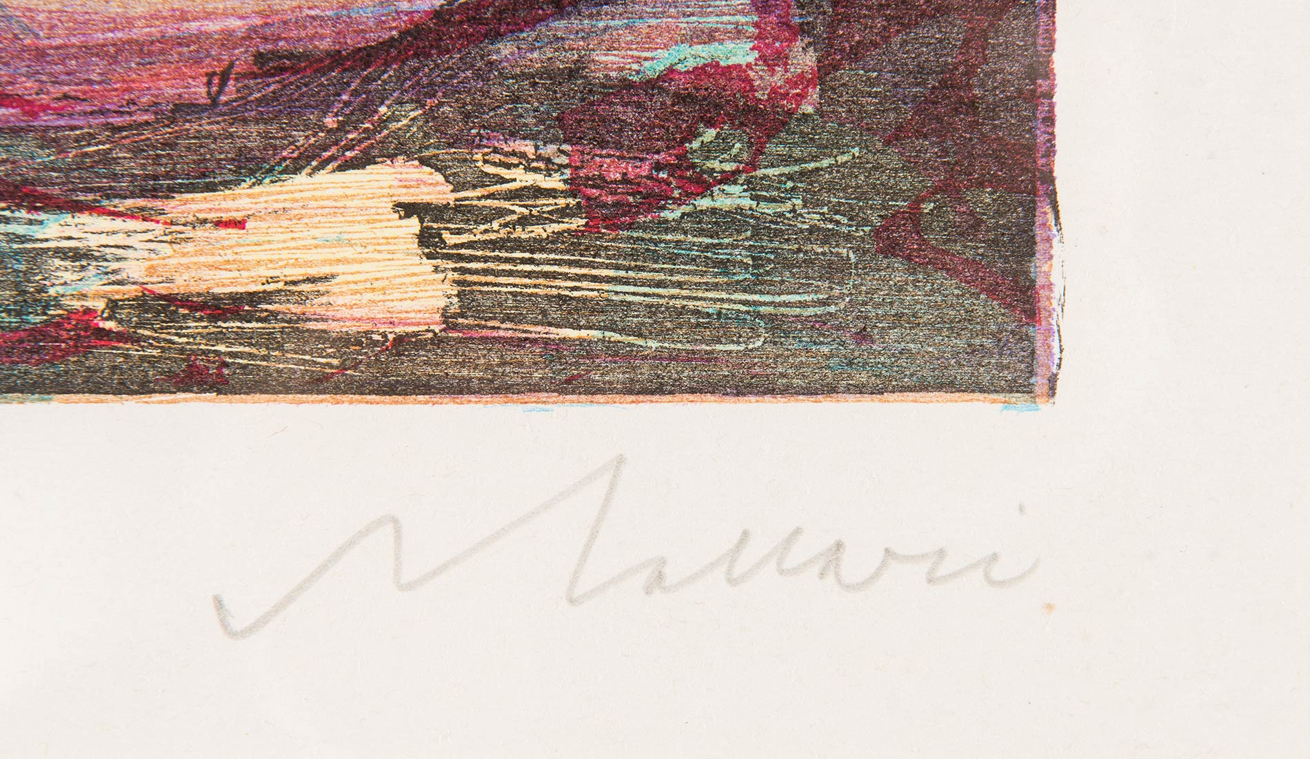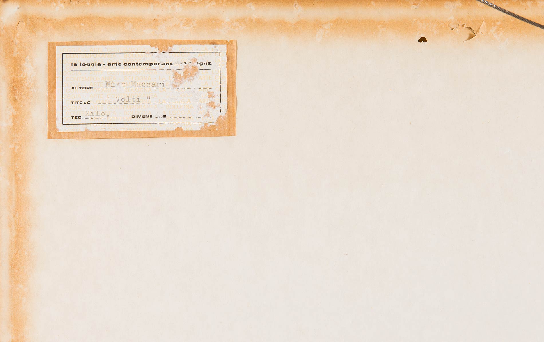 Xilografia a colori, firmata in basso a destra Maccari, numero di tiratura in basso a sinistra 21/99 e timbro a secco Nemo Galleni, Lastra H cm 39x53.5 Al retro etichetta Galleria La Loggia – Arte Contemporanea – Bologna.
