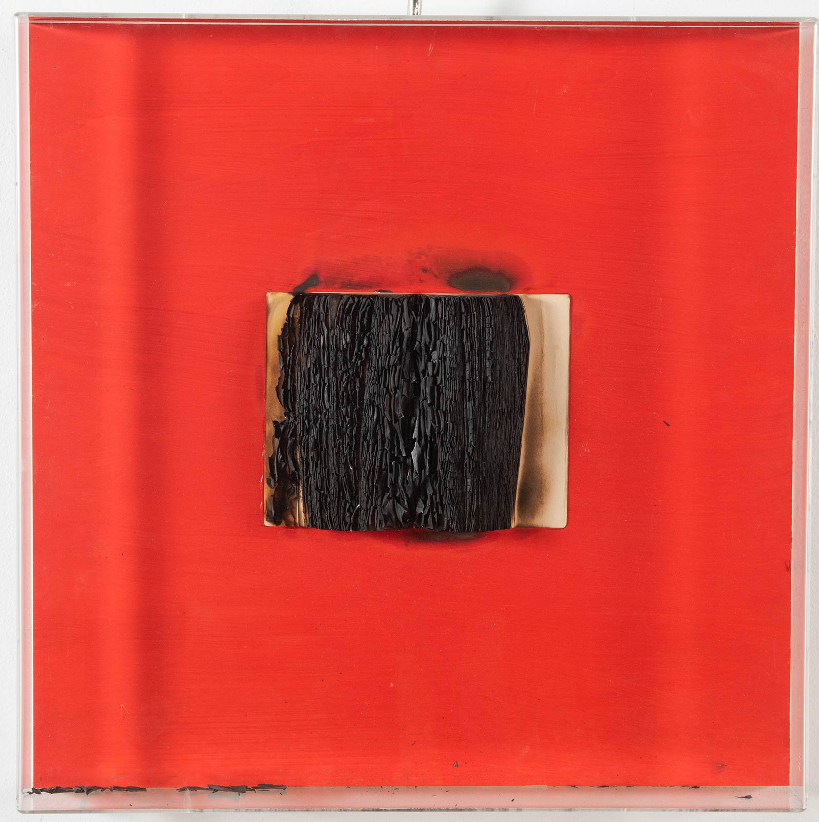 Libro bruciato su tavola dipinta entro plexiglas, firmato e datato al retro Bernard Aubertin 2010, H cm 60x60 Provenienza: Collezione privata – Milano.