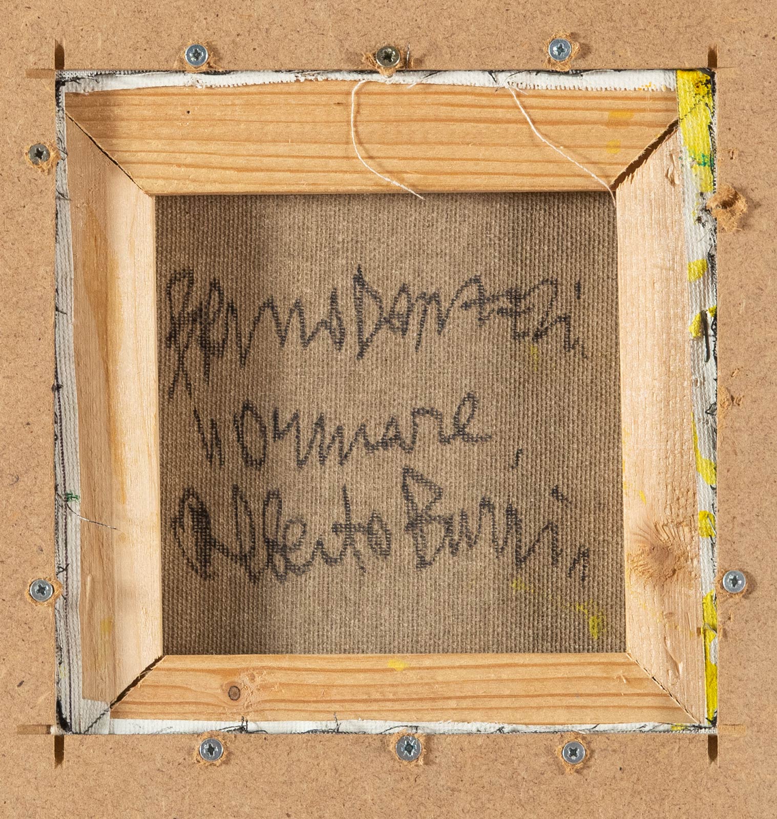 Olio e tecnica mista su tela, firmato in basso a destra Donzelli, al retro titolo e firma ‘Bruno Donzelli/Ormare/Alberto Burri’ ed etichette H cm 20x20 Opera accompagnata da certificato di autenticità su fotografia a firma Donzelli e timbro a secco ed etichetta Studio Giovanna Simonetti – Milano