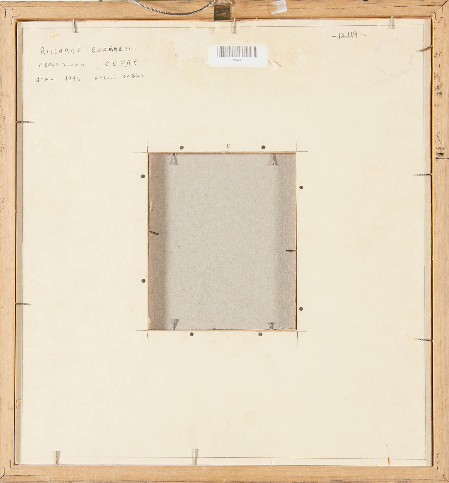 Tecnica mista su carta, firmata in basso a destra Riccardo Guarnieri 91, H cm 15x12.5Al retro reca iscrizione: ‘Riccardo Guarnieri/Esposizione C.E.P.A.C./Anno 1994 Aprile Maggio’. Opera accompagnata da certificato di autenticità su fotografia a firma Guarnieri – Firenze 30-3-09