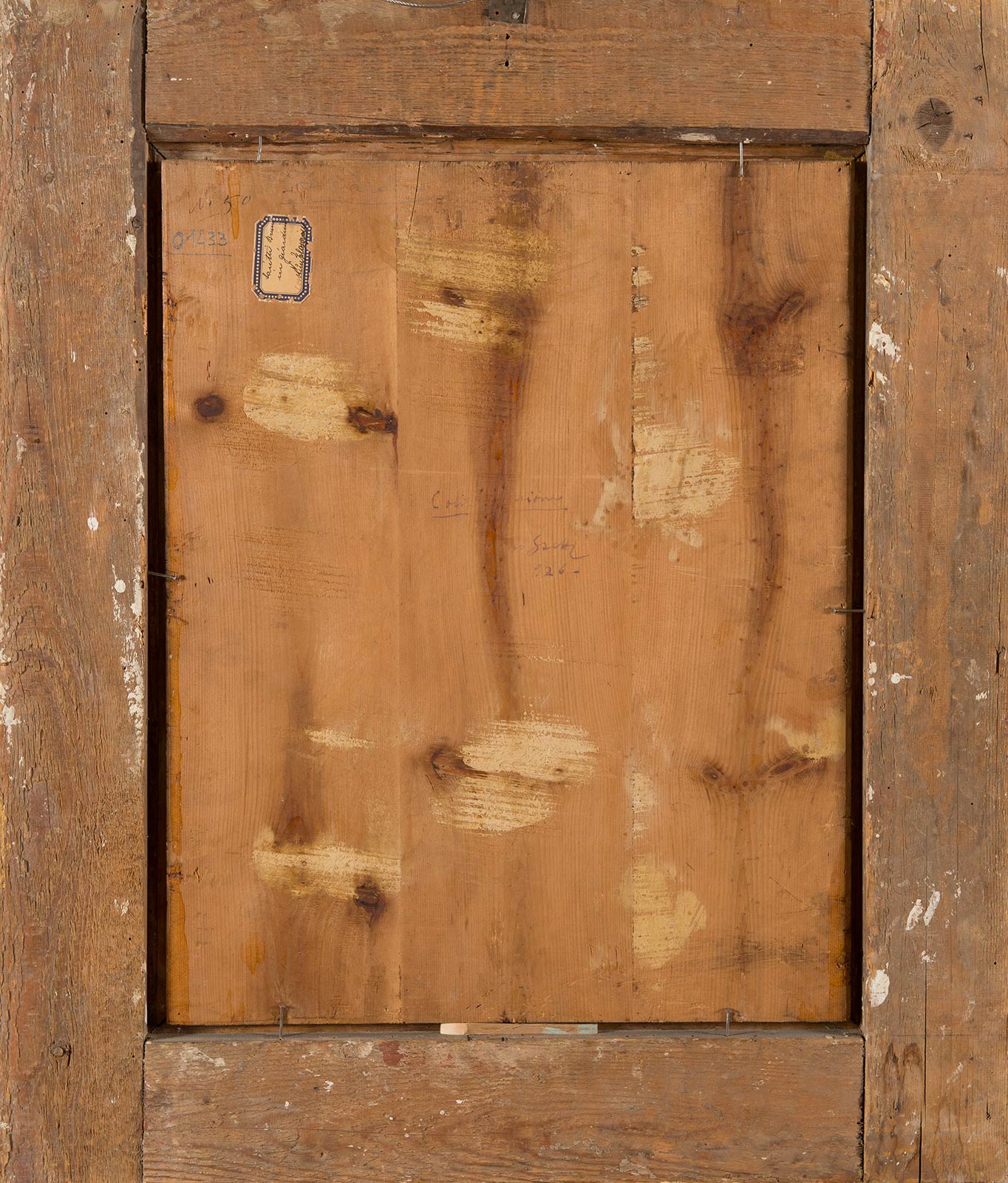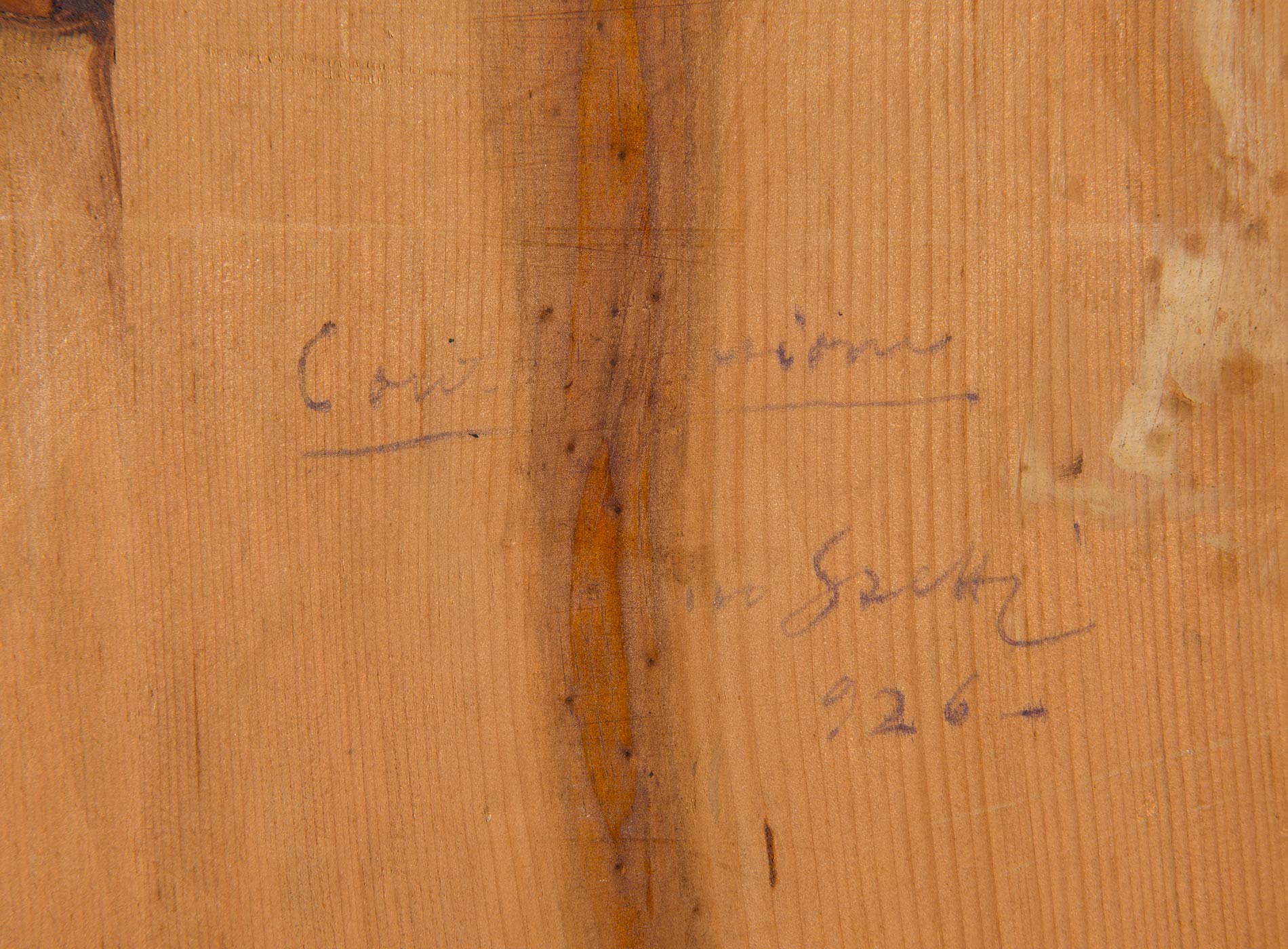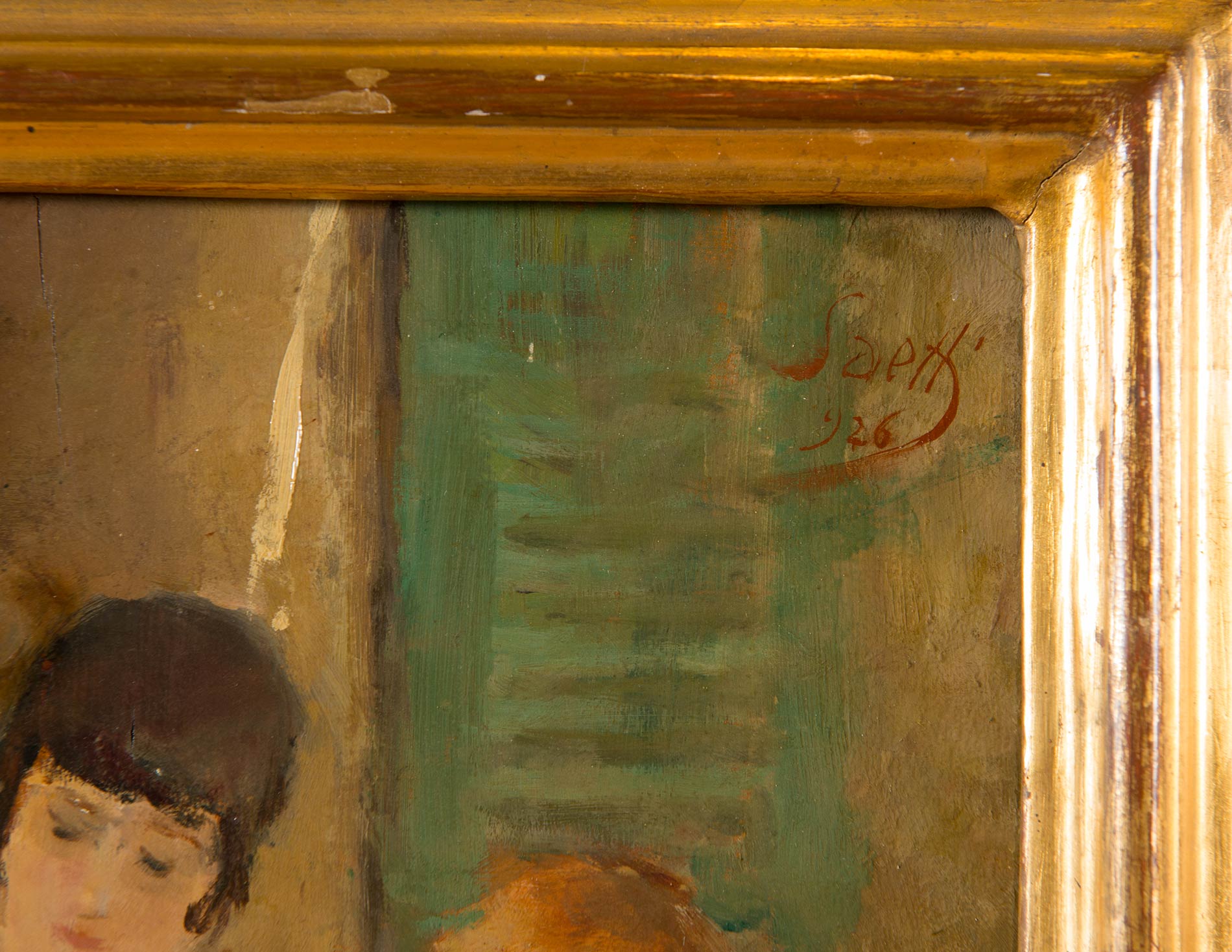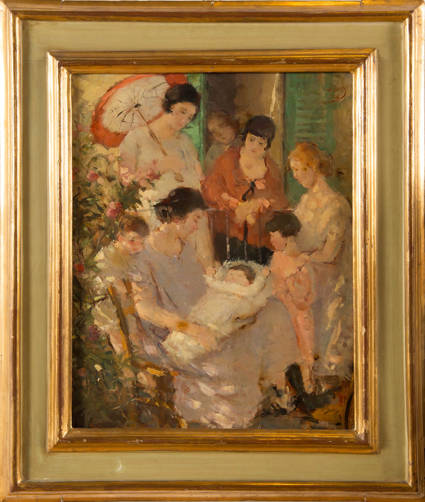 Olio su tavola, firmato e datato in alto a destra Saetti 926, al retro reca etichetta Saetti Bruno/in giardino/n°2/composizione’ e iscrizione a matita ‘In giardino’ ‘Composizione/Saetti/926’ e numeri ‘N.50’ ‘01433’, H cm 50x40