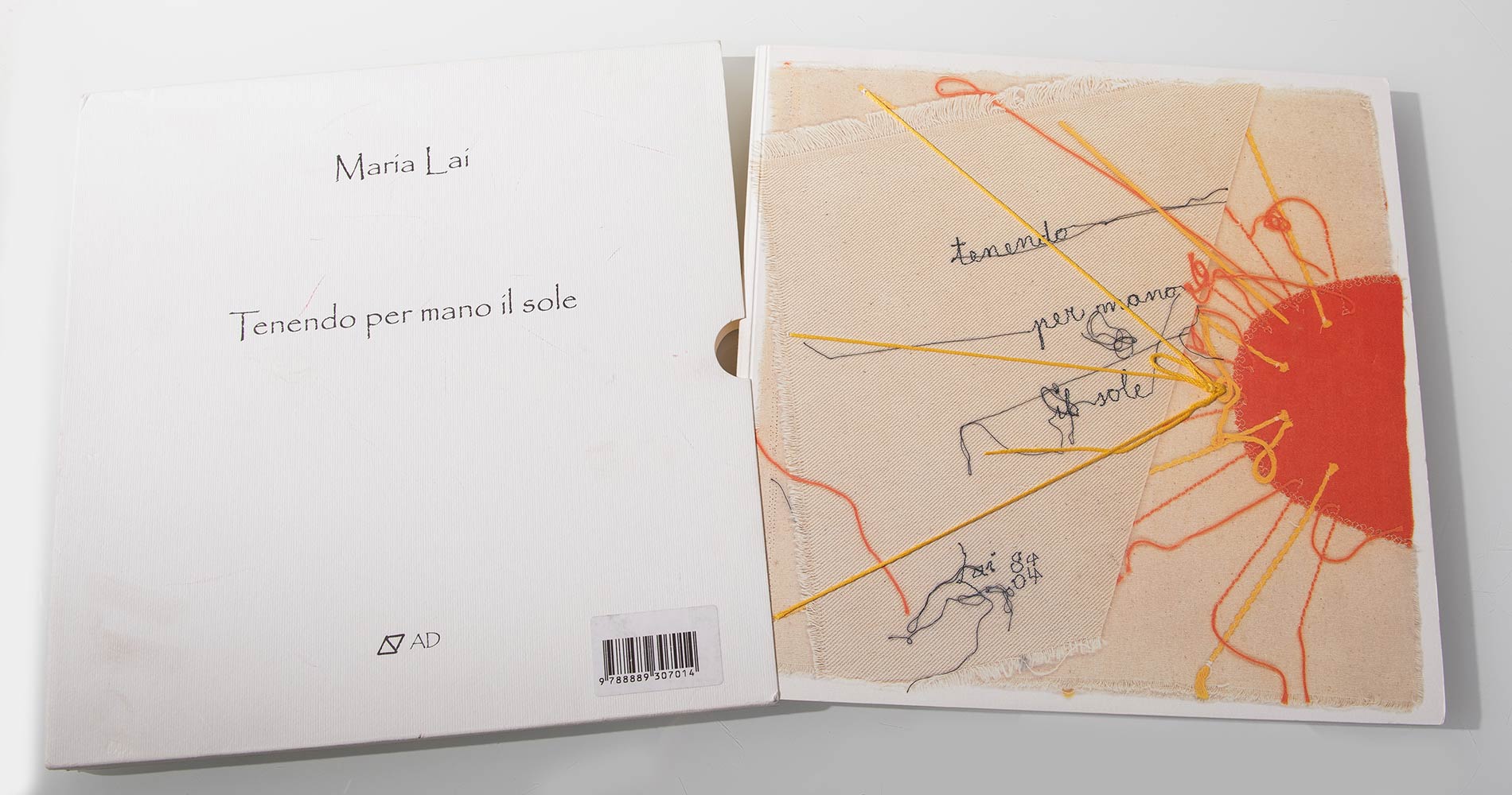 Applicazione di fili di cotone sulla copertina del libro ‘Maria Lai, Tenendo per mano il sole’, testo di Maria Lai, Anna Dolfi & Gianni Murtas, Ed. Arte Duchamp Cagliari 2004, H cm 27x28x1.5