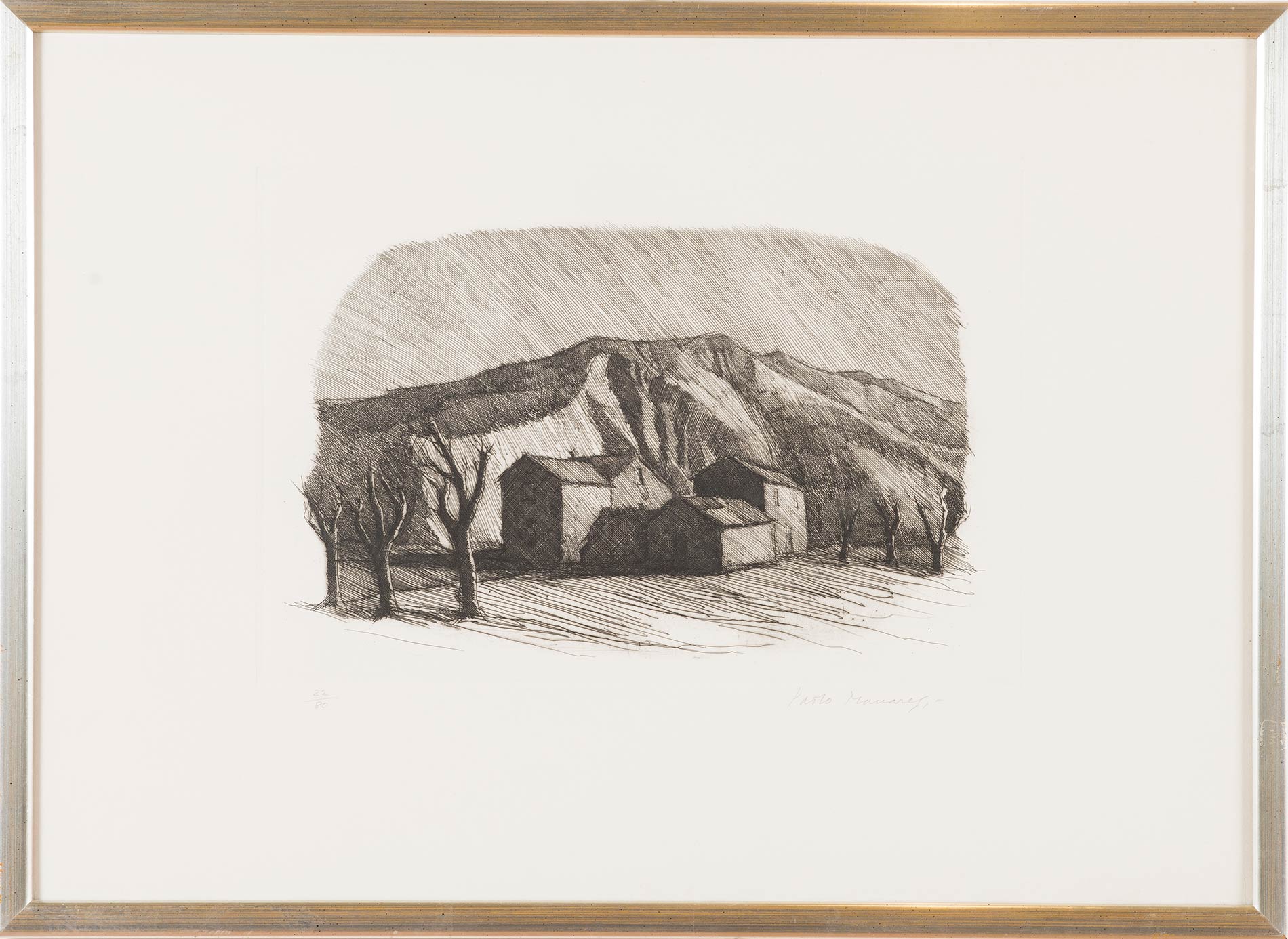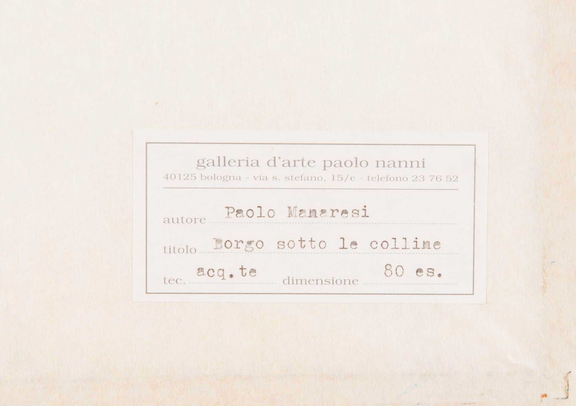 Acquaforte, firmata in basso a destra Paolo Manaresi, numero di tiratura in basso a sinistra 22/80, Lastra H cm 29.5x43 Al retro etichetta Galleria d’Arte Paolo Nanni – Bologna.