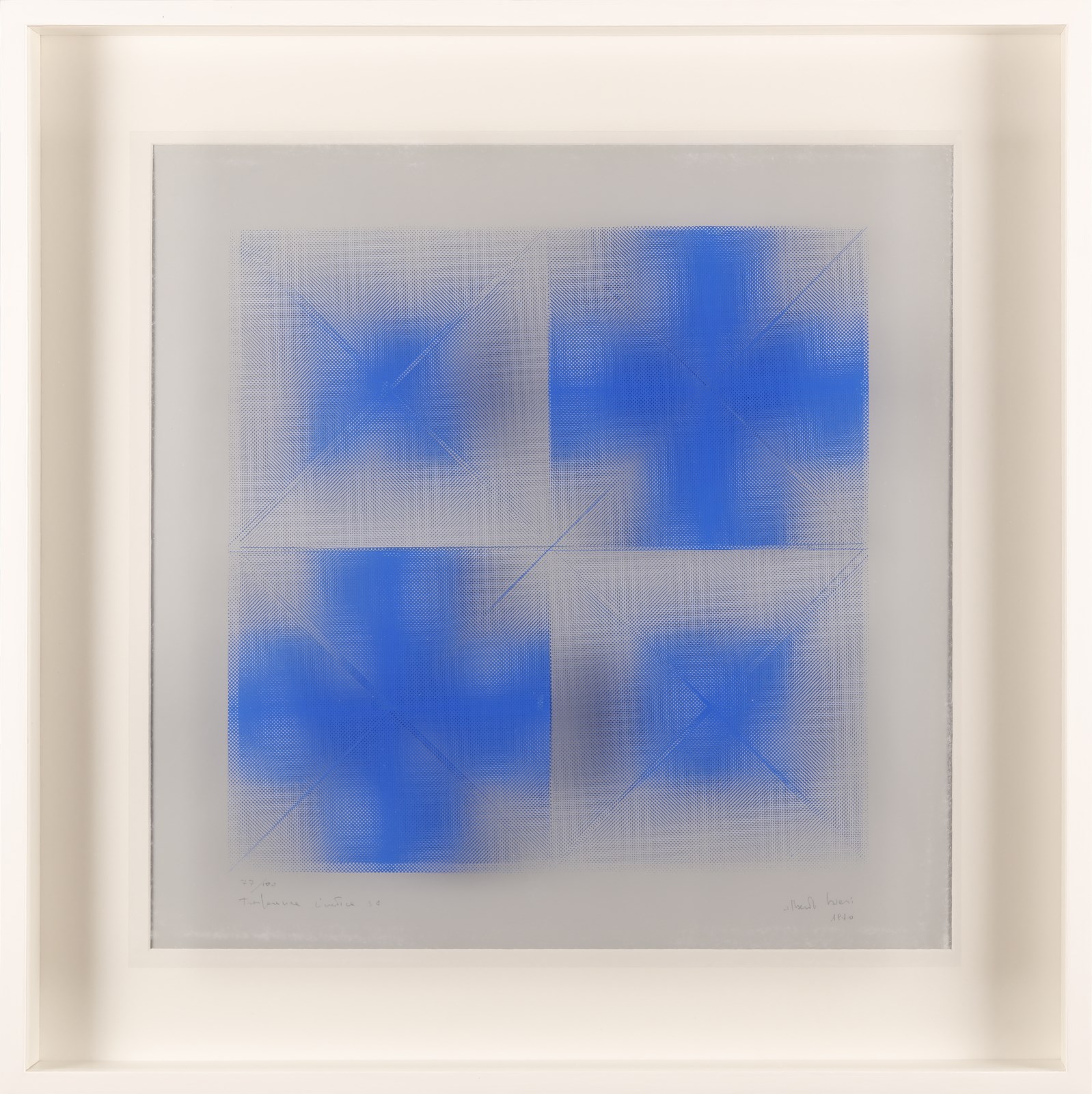 BIASI ALBERTO (n. 1937) Progetto S4, trasparenza cinetica in blu su fondo grigio chiaro. 1970. Doppia serigrafia su pvc trasparente e cartoncino.. Cm 47,50 x 47,50. 77/100. Tiratura, titolo, firma e anno a matita in basso. Giuseppe Strano Editore, Padova. . Cornice presente