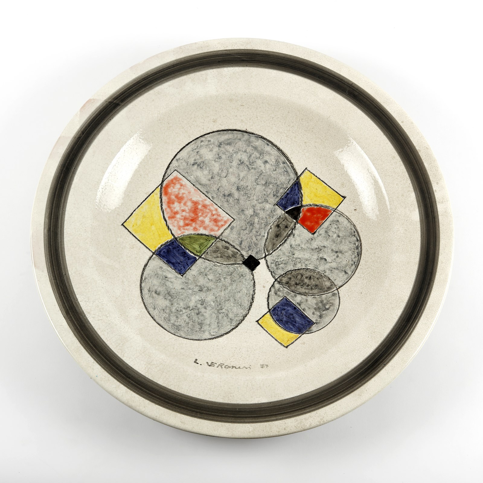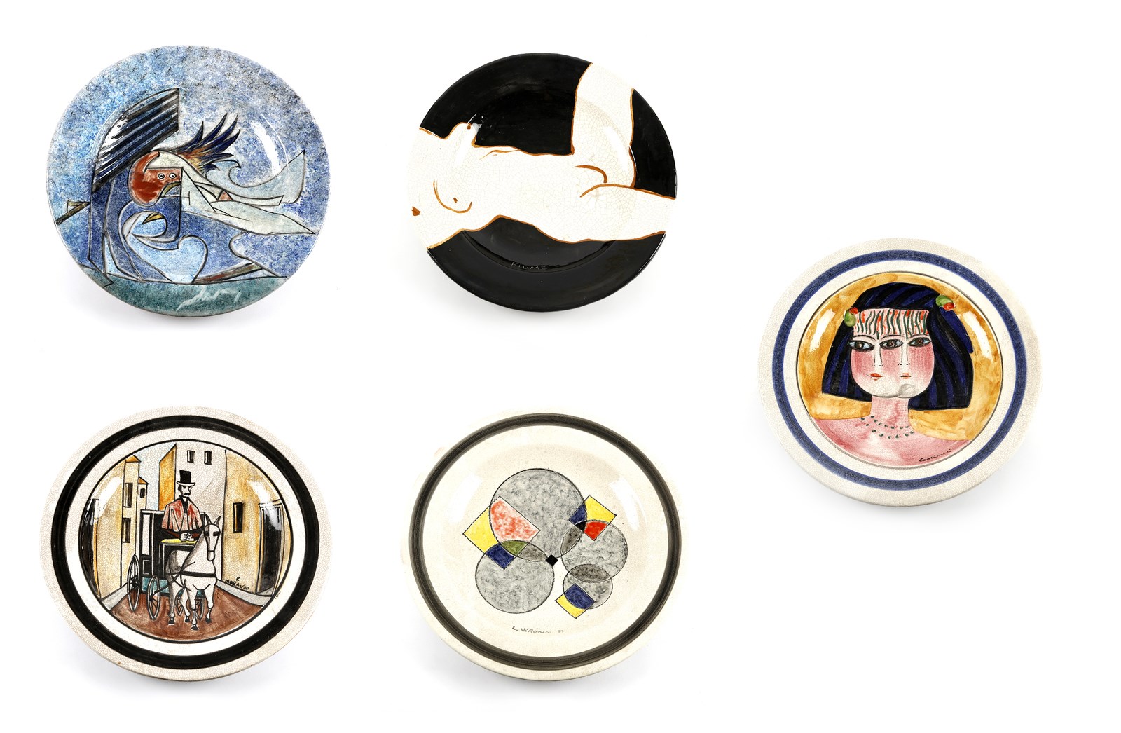ARTISTI VARI Lotto composto da 5 piatti. piatto. Cm 50,00. 1. Salvatore Fiume. 27/50. Firma in alto, tiratura al retro. 2. Gianni Dova. P.A. Tiratura al retro. 3. Pietro Morando. P.A. Firma in basso, tiratura al retro.4. Luigi Veronesi. P.A. Firma e anno in basso a destra, 1971, tiratura al retro. 5. Bruno Cassinari. P.A. Firma in basso a destra, tiratura al retro.