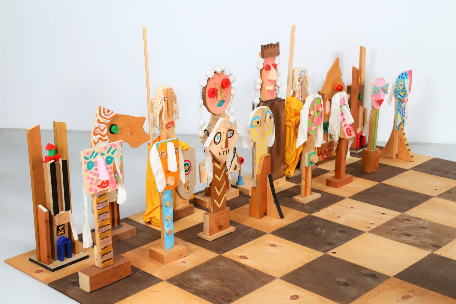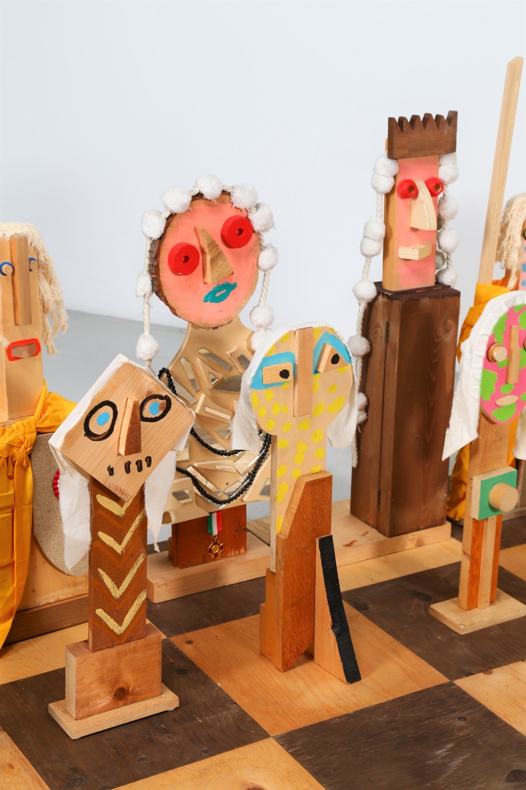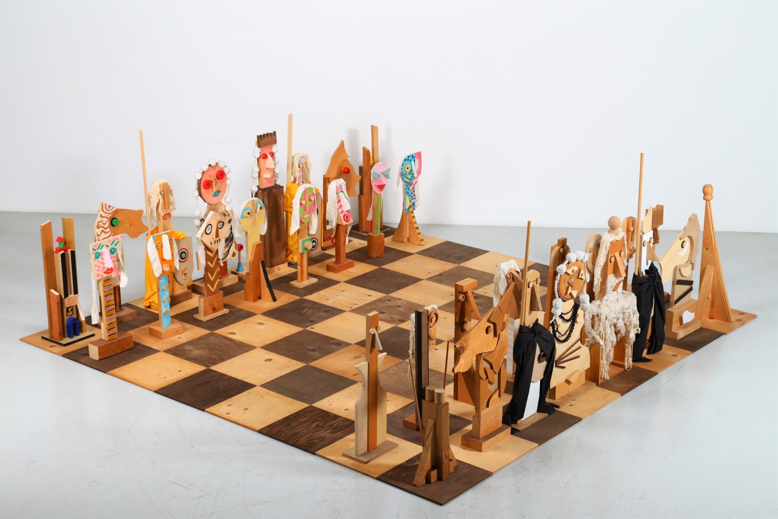 BAJ ENRICO (1924 - 2003) Il gioco degli scacchi. . 1988. Legno. Cm 272,00 x 75,00 x 272,00. Edizione completa: 30 + V. Esemplare: 12. Mastrogiacomo Edizioni - Padova. L'opera è costituita da 32 sculture (la cui altezza media è di 75 cm) ognuna diversa dall'altra, eseguite completamente a mano su prototipo dell'artista e 32 tavolette da accostare su un piano o sul pavimento in modo da creare una scacchiera. Il materiale principalmente usato è il legno e, visto l'ingombro della scacchiera è possibile esporre i pezzi su una scaffalatura a tre ripiani simile a una libreria occupando a parete uno spazio di 2,50 metri in altezza per 2,50 metri in larghezza per 25 cm di profondità. Le tavolette di 34x34 cm possono essere raccolte e impilate. Ogni pezzo reca un sigillo e la numerazione a mano. Autentica su fotografia firmata dall'artista e con sigillo dell'editore. L'opera è accompagnata dal libro "Gli Scacchi di Baj", Mastrogiacomo Edizioni - Padova, con introduzione di Pietro Bellasi e testi di Olivier Revault d'Allones.