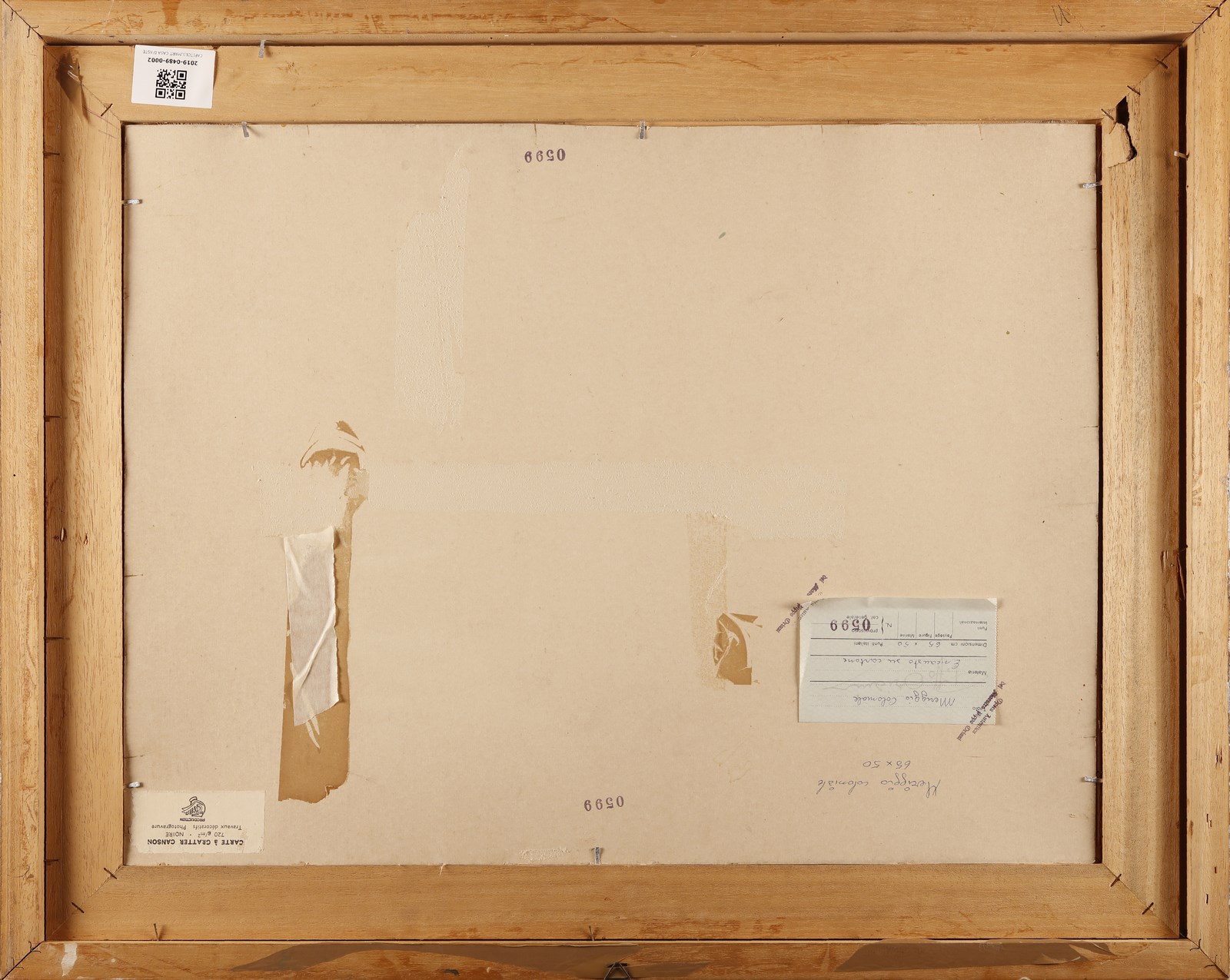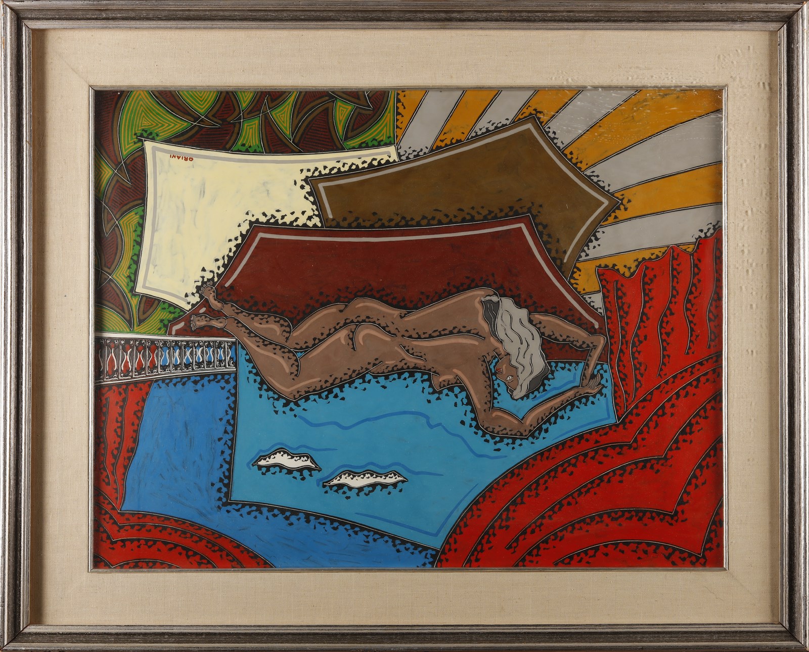 ORIANI PIPPO (1909 - 1972) Meriggio Coloniale (Nudo in riposo). 1960. Encausto su cartone gessato. Cm 65,00 x 50,00. Firma in basso a destra. Autentica su fotografia di Gabriele Oriani. Opera archiviata presso la Oriani Foundation, Canada come da documentazione fotografica allegata all'opera riportante il relativo numero d'inventario. Cornice presente