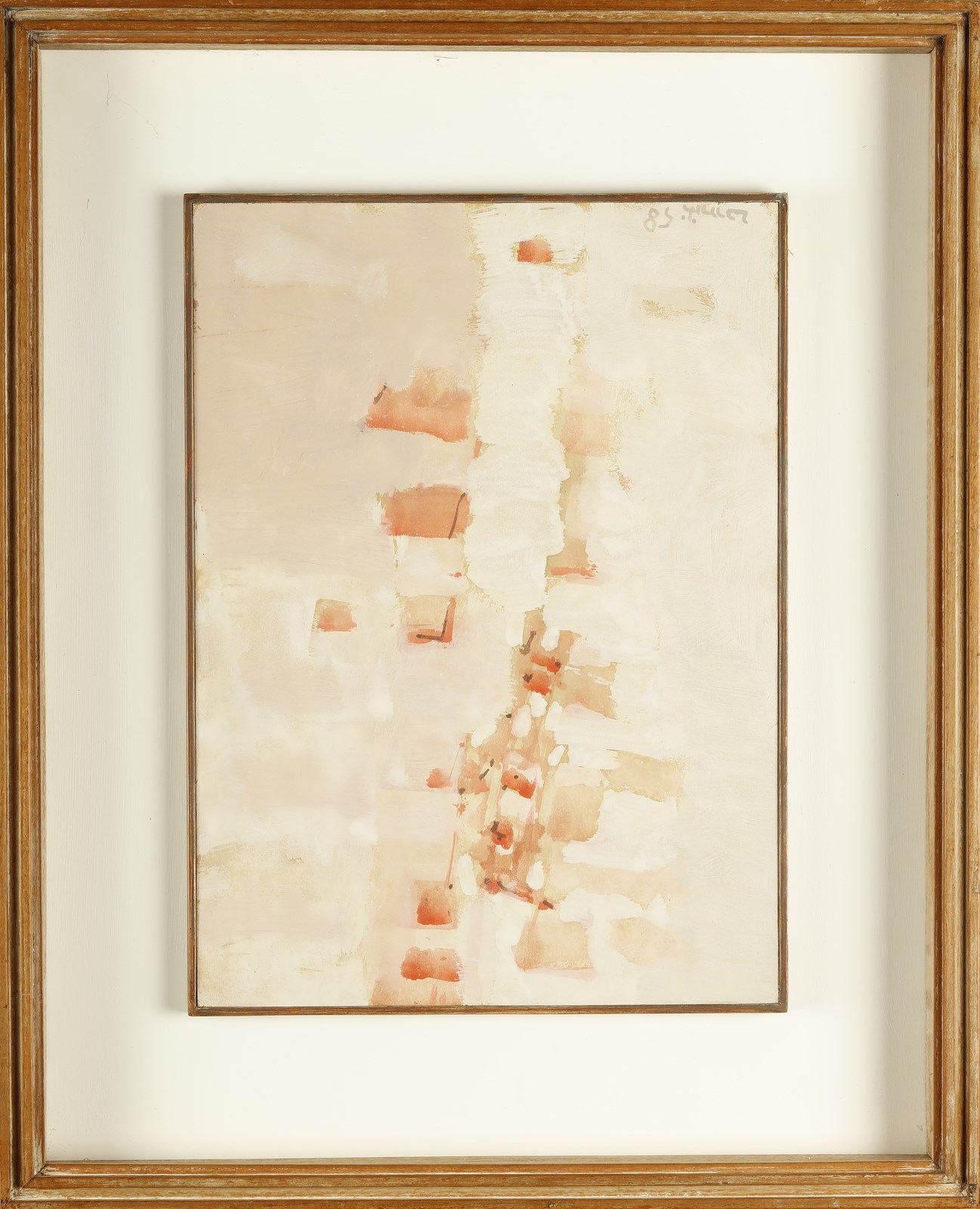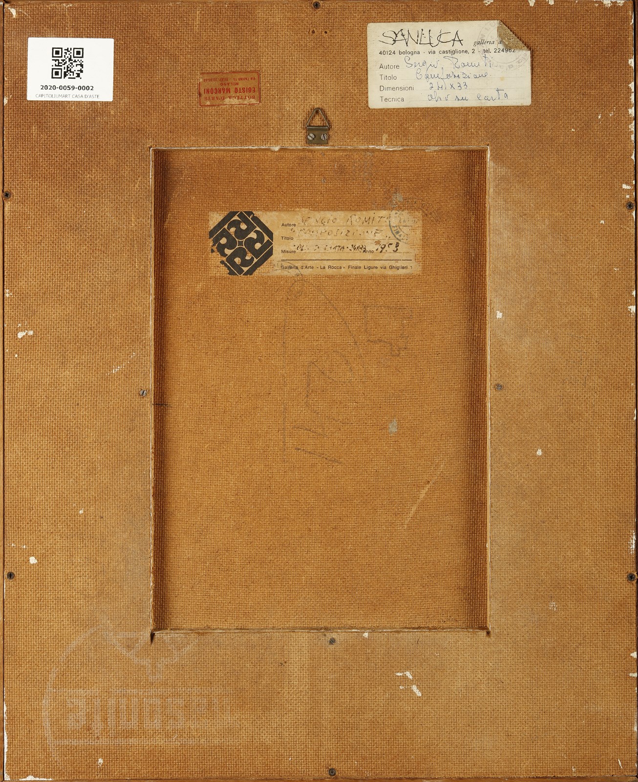 ROMITI SERGIO (1928 - 2000) Composizione. 1958. Tecnica mista su cartone. Cm 23,50 x 33,00. Firma e anno in basso a sinistra. Al retro cartiglio descrittivo Galleria d'arte Sanluca, Bologna e Galleria d'arte La Rocca, Finale ligure. Cornice presente