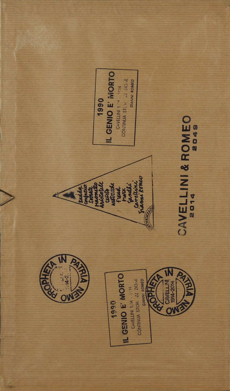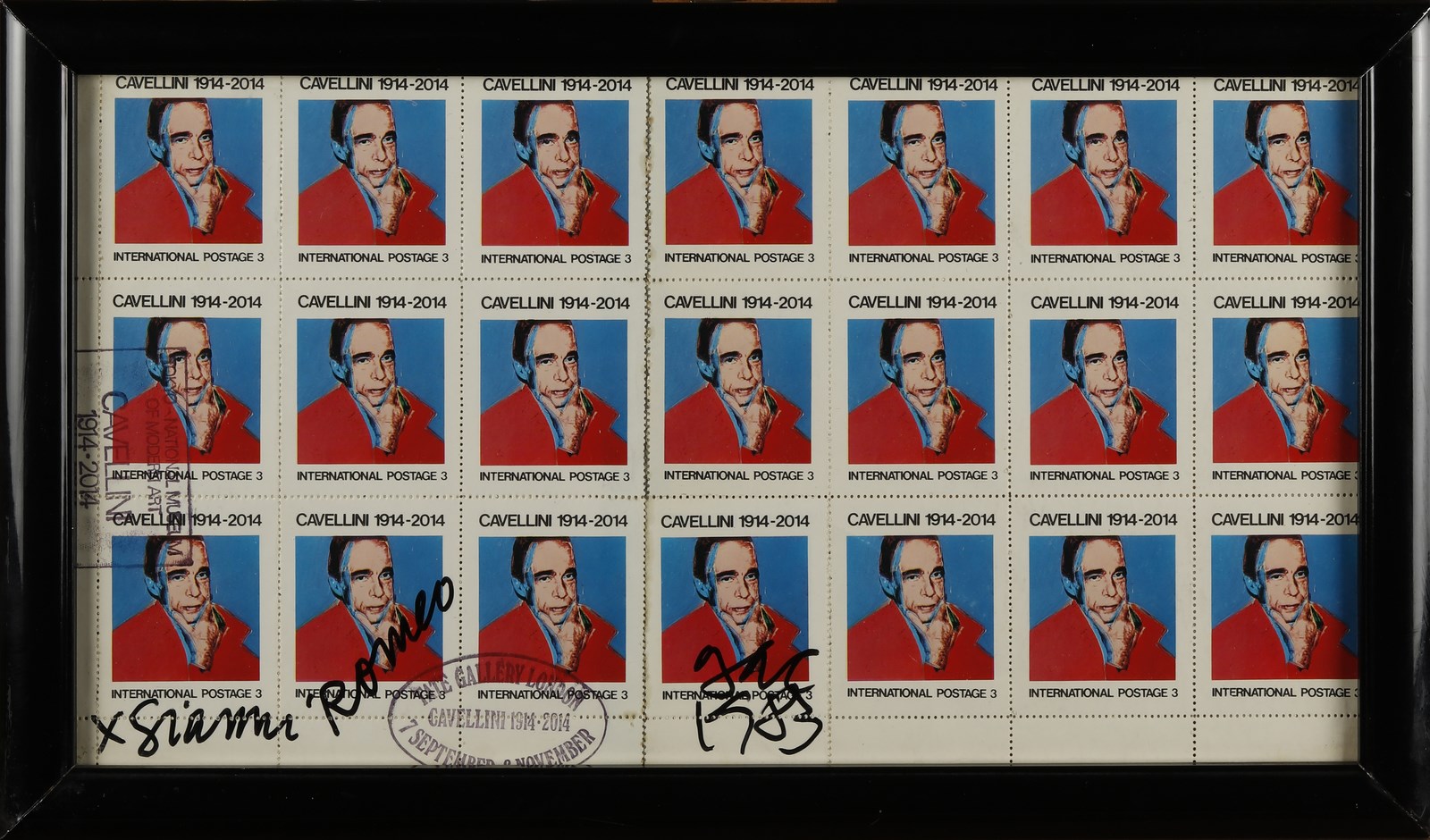 CAVELLINI GUGLIELMO ACHILLE (1914 - 1990) Il genio è morto. 1983. Francobolli. Cm 39,00 x 23,00. Dedica, firma e anno in basso a sinistra. Cornice presente