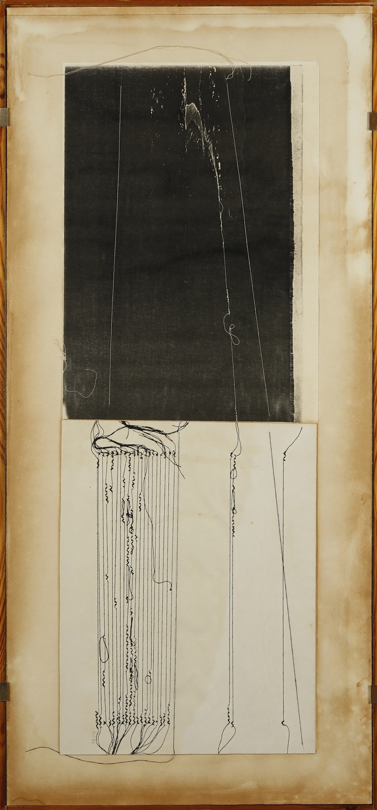 LAI MARIA (1919 - 2013) Senza titolo. . 1982. Xerografia con intervento in filo. Cm 63,00 x 23,00. Firma e anno a matita in basso a destra. Opera archiviata presso l'Archivio Maria Lai, Lanusei come da documentazione fotografica allegata all'opera riportante il relativo numero d'inventario. Cornice presente