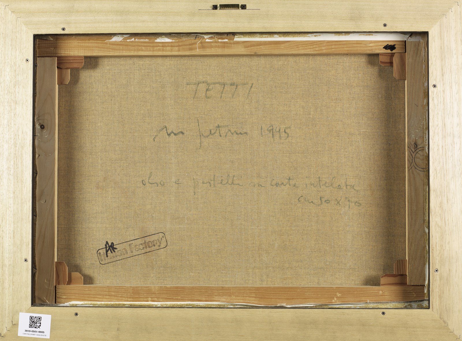 PETRUS MARCO (n. 1960) Tetti. 1995. Tecnica mista su carta su tela. Cm 70,00 x 50,00. Firma e anno in basso a destra. Al retro titolo, firma, anno e timbro Italian Factory.Autentica dell'artista su fotografia. Provenienza: DL Arte, Milano. Cornice presente