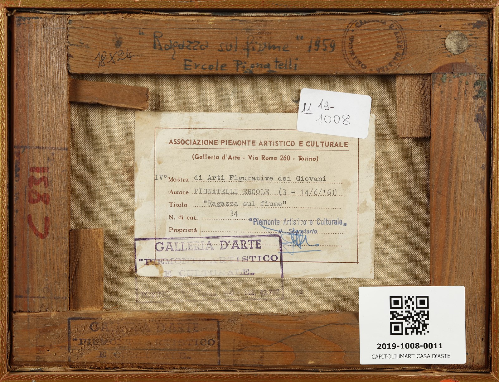 PIGNATELLI ERCOLE (n. 1935) Ragazza sul fiume. 1959. Olio su tela . Cm 24,50 x 18,00. Al retro cartiglio espositivo della IV Mostra di Arti Figurative dei Giovani, 3-14 Giugno 1961, Galleria d'arte, Torino e timbro Galleria d'Arte Galatea, Portofino. Cornice presente