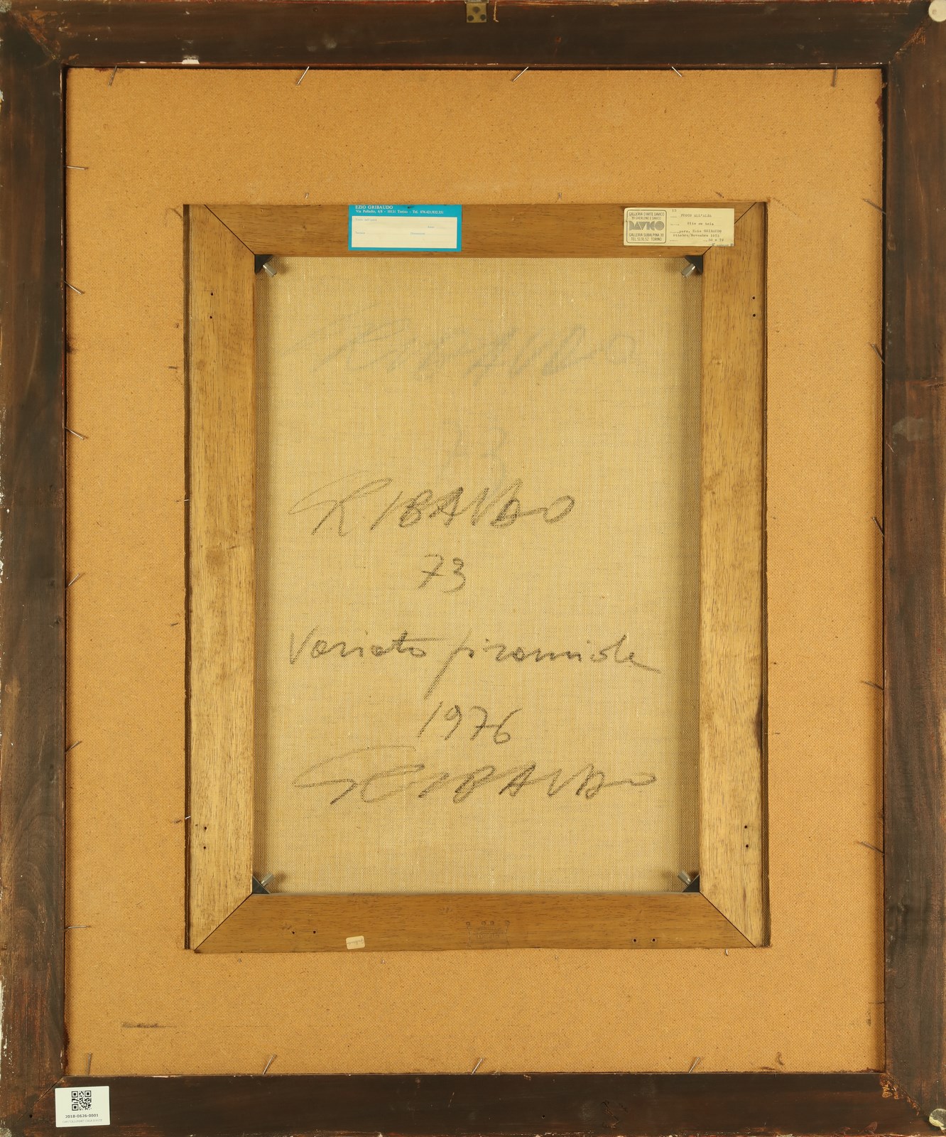 GRIBAUDO EZIO (n. 1929) Fuoco all'alba. 1973. Olio su tela . Cm 60,00 x 80,00. Firma in basso a destra. Al retro titolo, firma, anno e cartiglio descrittivo Galleria d'arte Davico. Pubblicazione: Gribaudo a cura di Mario Tosi, 30 Ottobre -20 Novembre 1973, Torino, pag.15. Cornice presente
