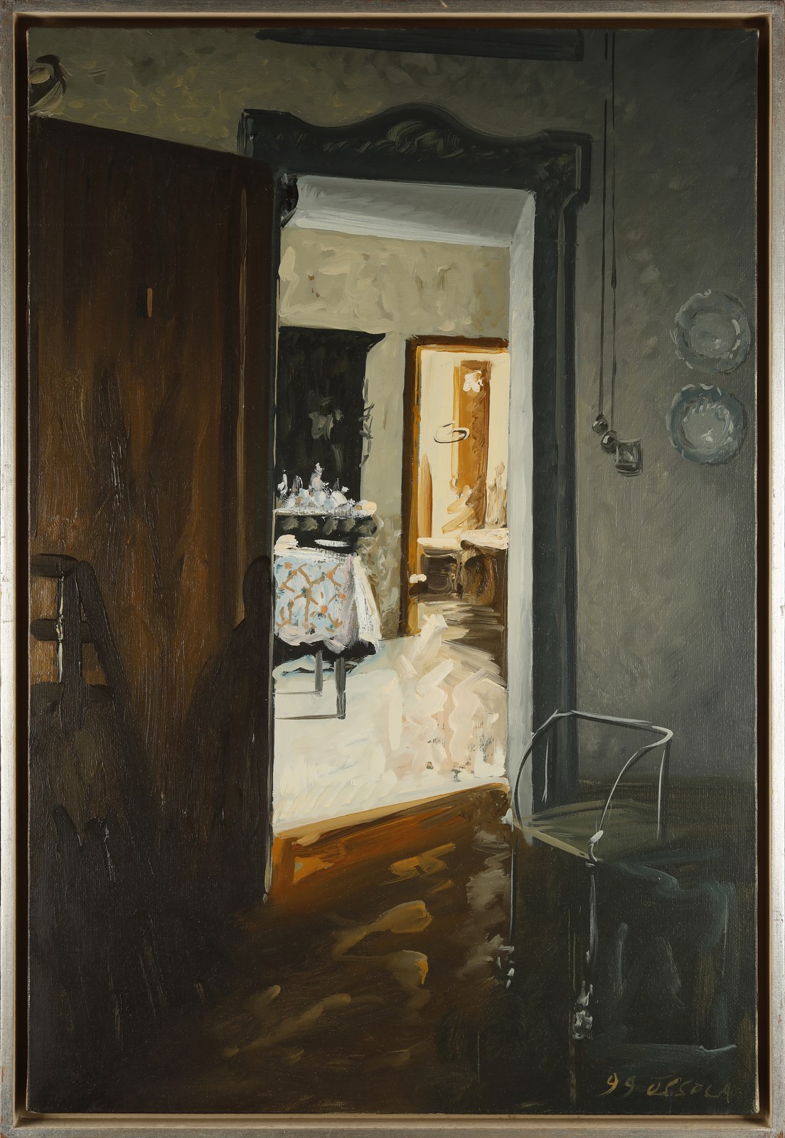 OSSOLA GIANCARLO (n. 1935) La porta. 1999. Olio su tela . Cm 60,00 x 90,00. Firma e anno in basso a destra. Al retro titolo, firma, anno e cartiglio descrittivo Galleria Il Chiostro. Cornice presente