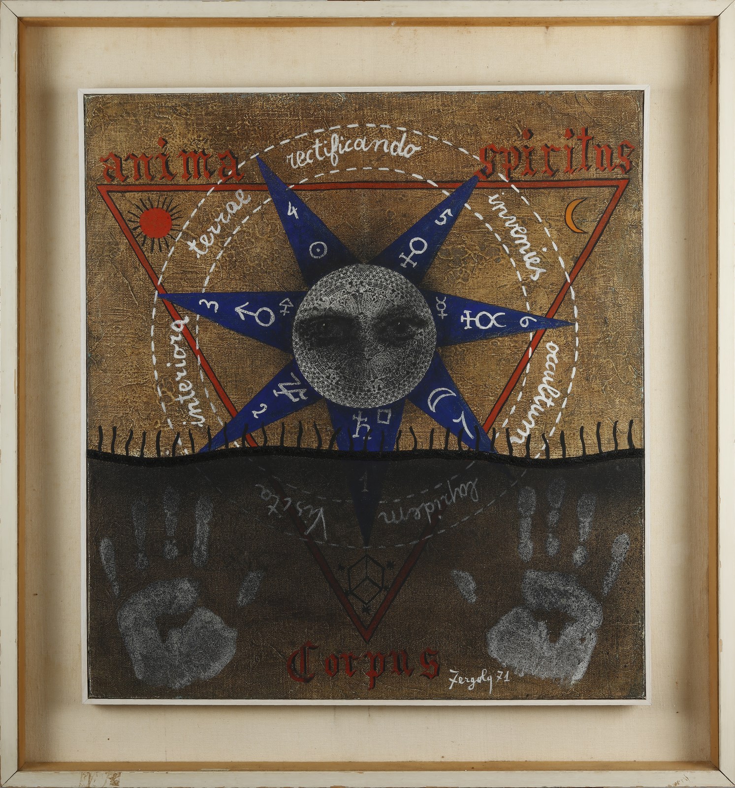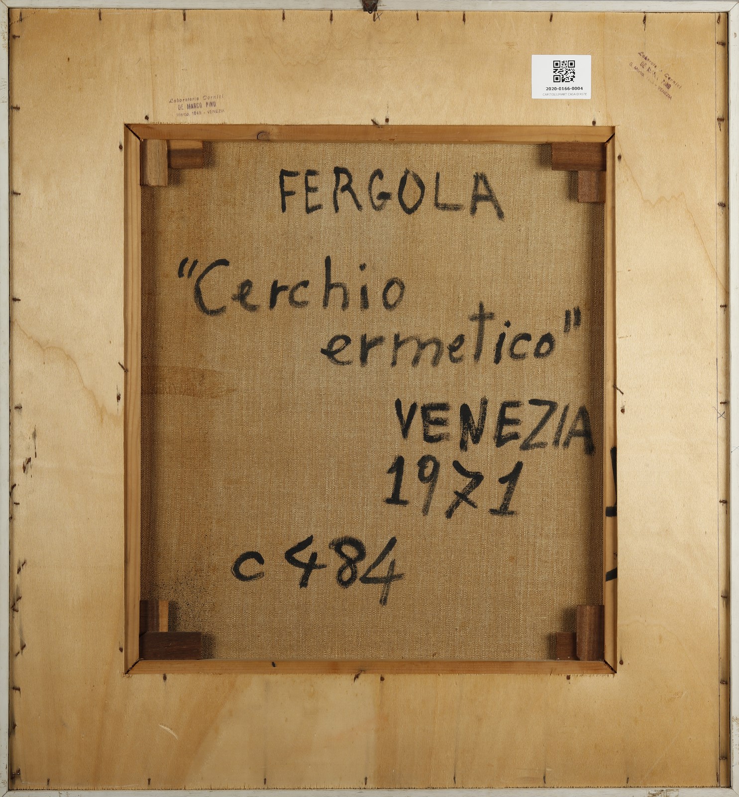 FERGOLA SERGIO (1936 - 1994) Cerchio ermetico. 1971. Tecnica mista su tela. Cm 50,00 x 55,00. Firma e anno in basso a destra. Al retro titolo, firma e anno. Cornice presente