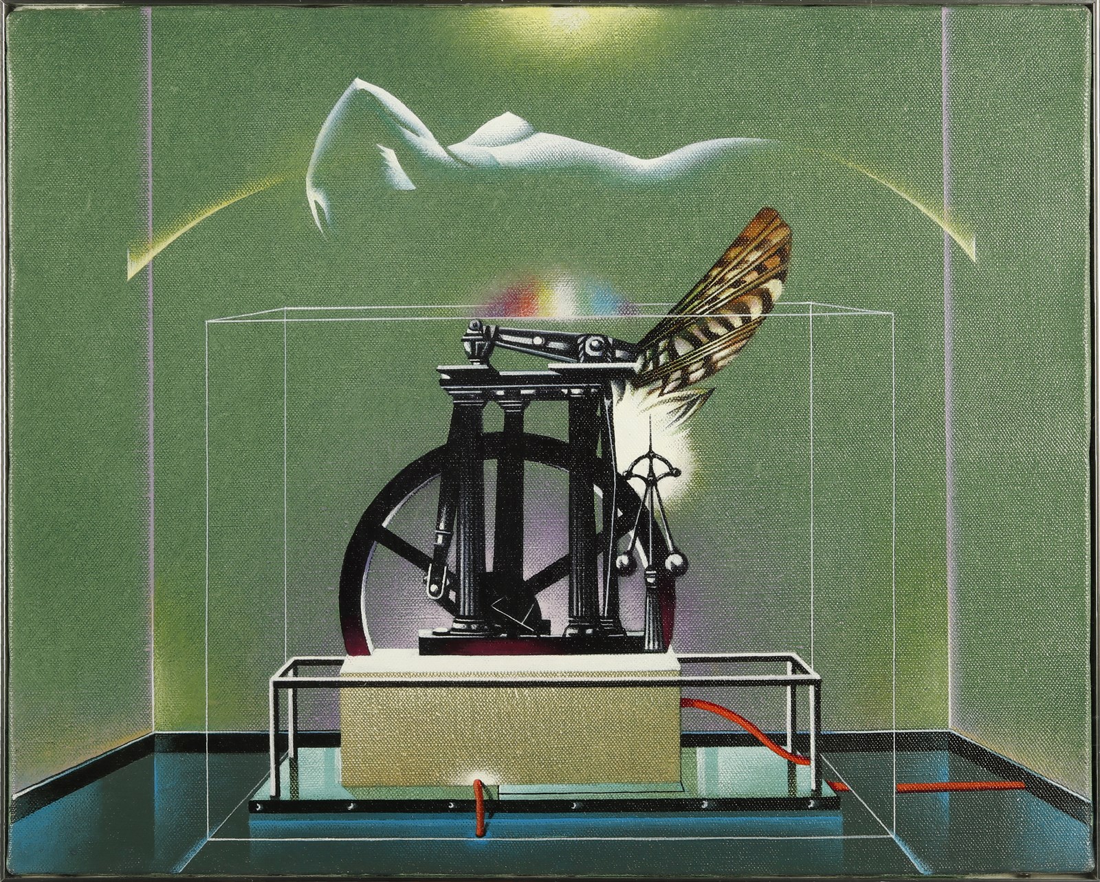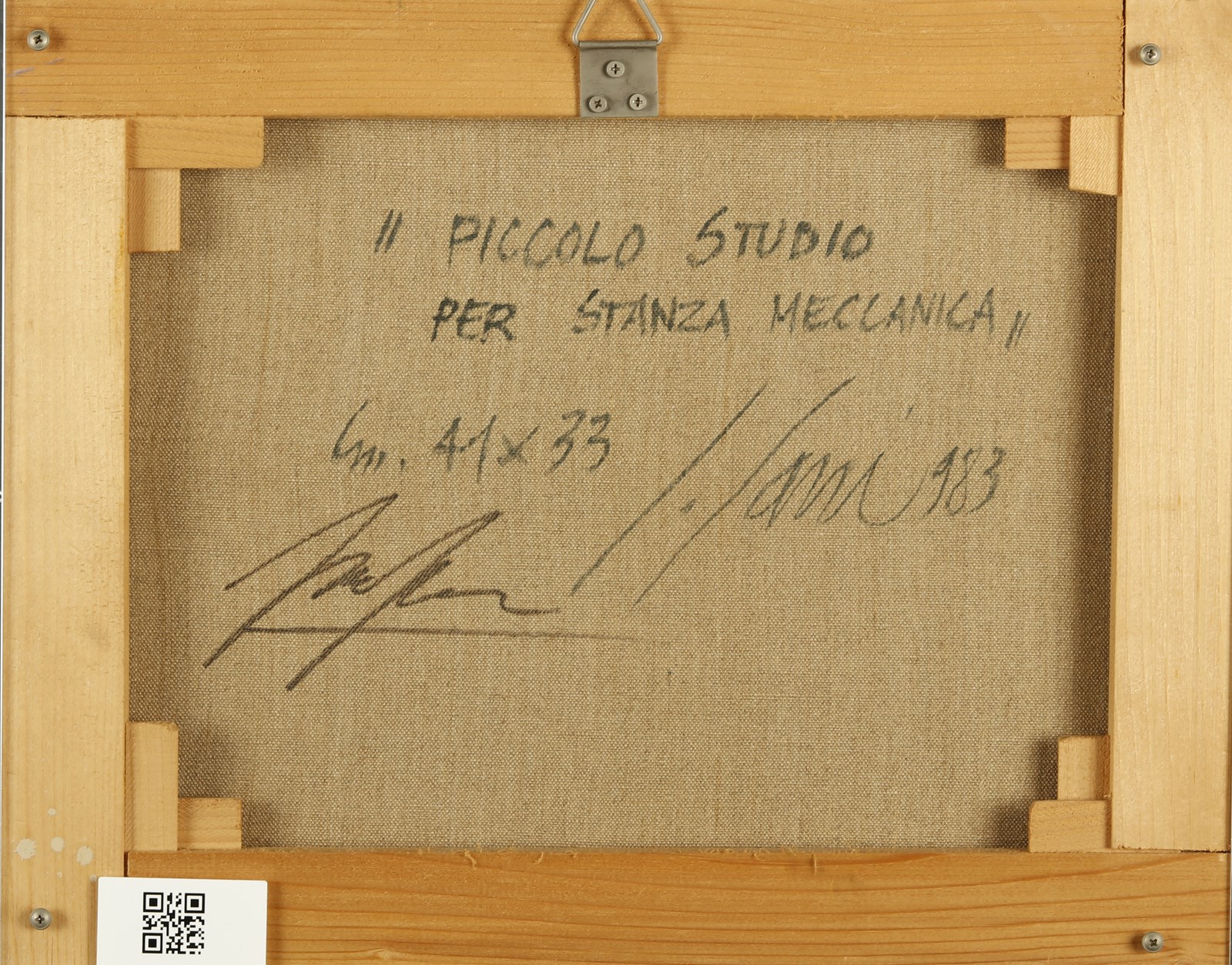 SARRI SERGIO (n. 1938) Piccolo studio per stanza meccanica. 1983. Acrilico su tela. Cm 41,00 x 33,00. Al retro titolo, firma e anno. Autentica dell'artista su fotografia. Cornice presente
