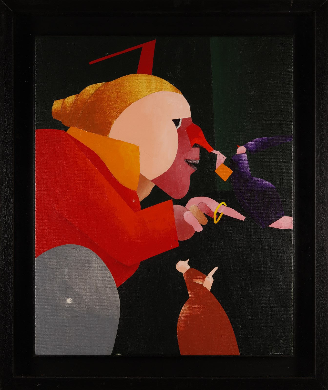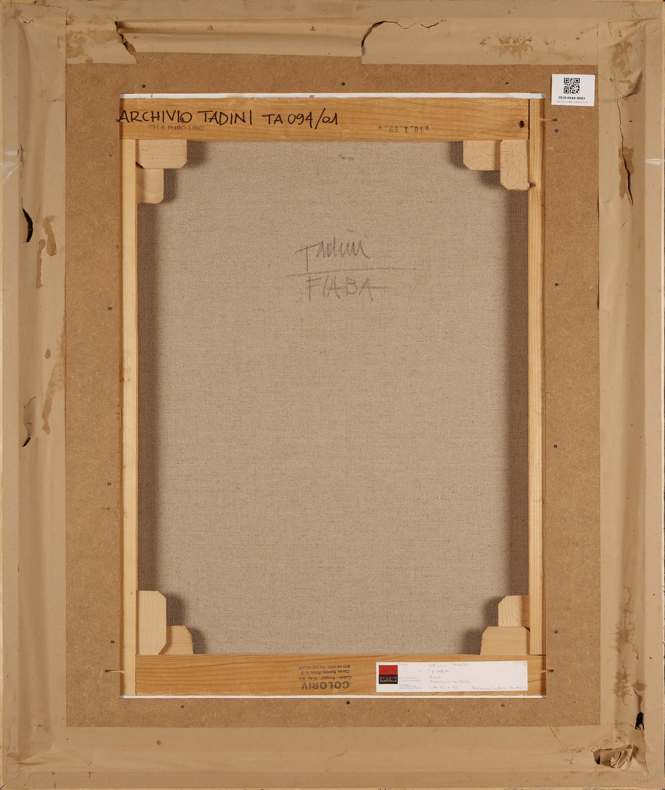 TADINI EMILIO (1927 - 2002) Fiaba. Acrilico su tela. Cm 65,00 x 81,00. Al retro titolo, firma e cartiglio descrittivo Studio Guastalla, Milano. Opera archiviata presso l'Archivio Emilio Tadini come da documentazione fotografica allegata all'opera riportante il relativo numero d'inventario e la firma dell'artista. Provenienza: Il Pastello di Marcello Persica, Roma; Collezione privata, Roma. Cornice presente