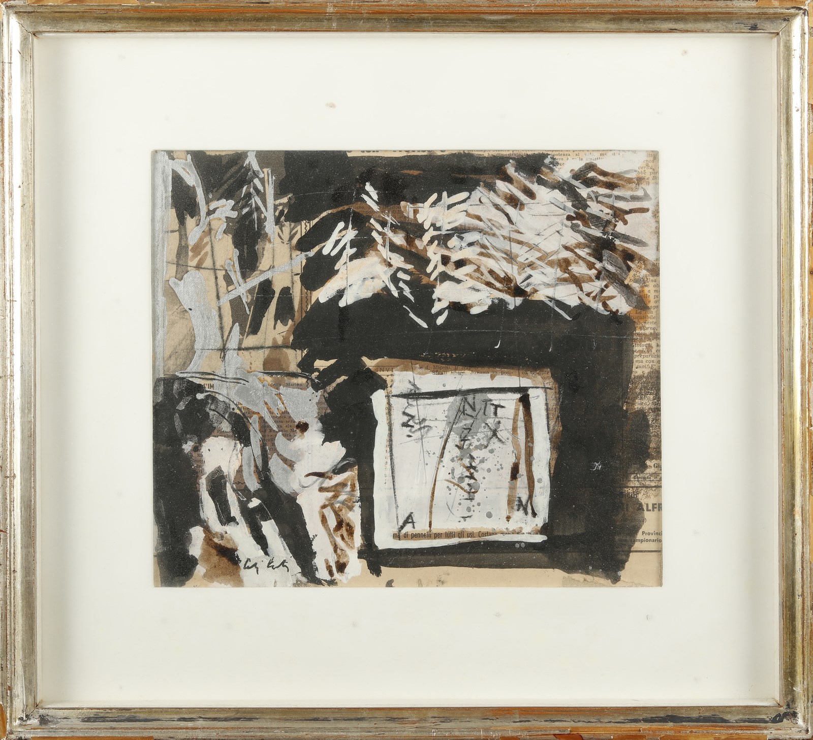 CELIBERTI GIORGIO (n. 1929) Terezin. 1968. Collage e olio su tela. Cm 30,00 x 26,00. Firma in basso a sinistra. Al retro titolo e firma. Provenienza: Galleria L'approdo, Torino. Esposizione: Il Ricordo di Terezin, 23 Aprile - 11 Maggio 1969, Galleria L'Approdo, Torino. Cornice presente