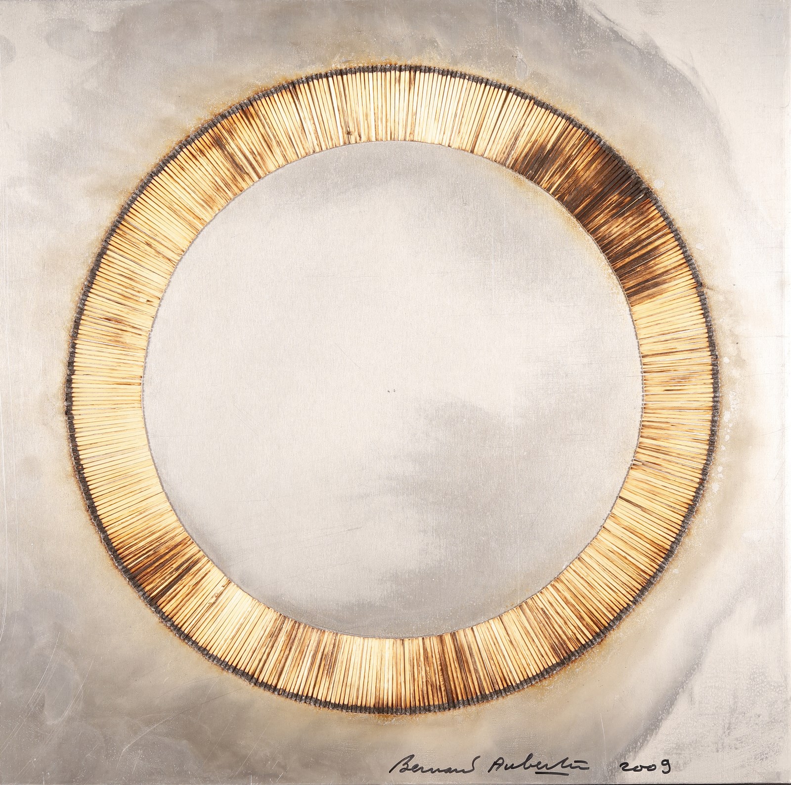 AUBERTIN BERNARD (1934 - 2015) Senza titolo. 2009. Fiammiferi su lamiera. Cm 50,00 x 50,00. Firma e anno in basso a destra. Autentica dell'artista su fotografia. Opera archiviata presso l'Archivio Bernard Aubertin, Brescia come da documentazione fotografica allegata all'opera riportante il relativo numero d'inventario. Cornice presente