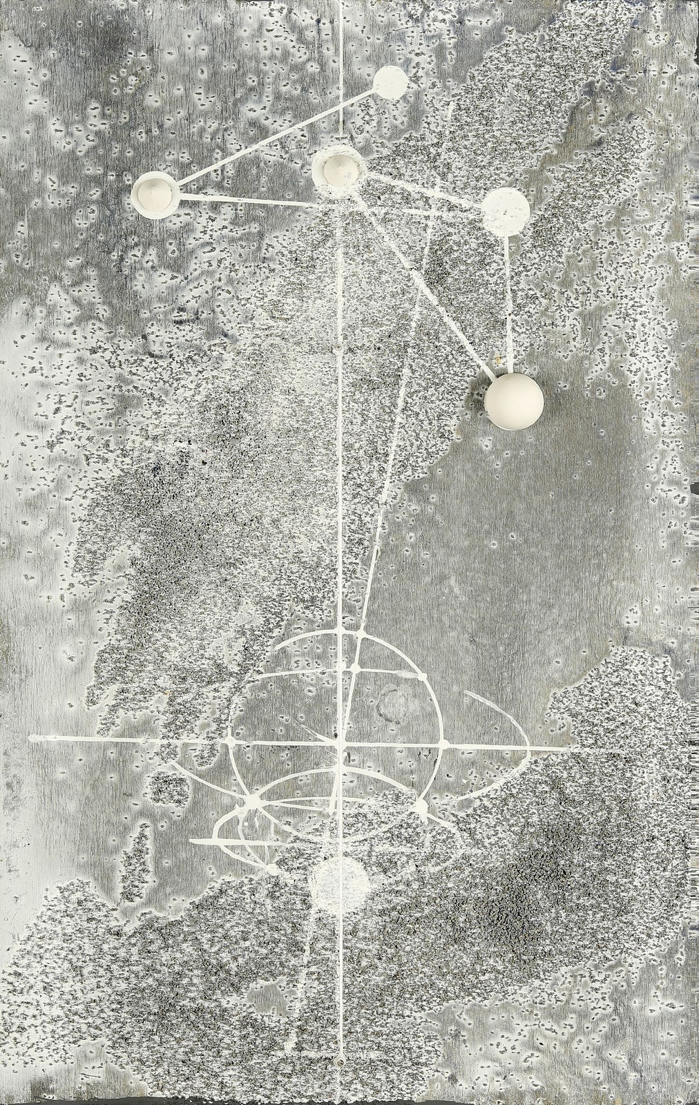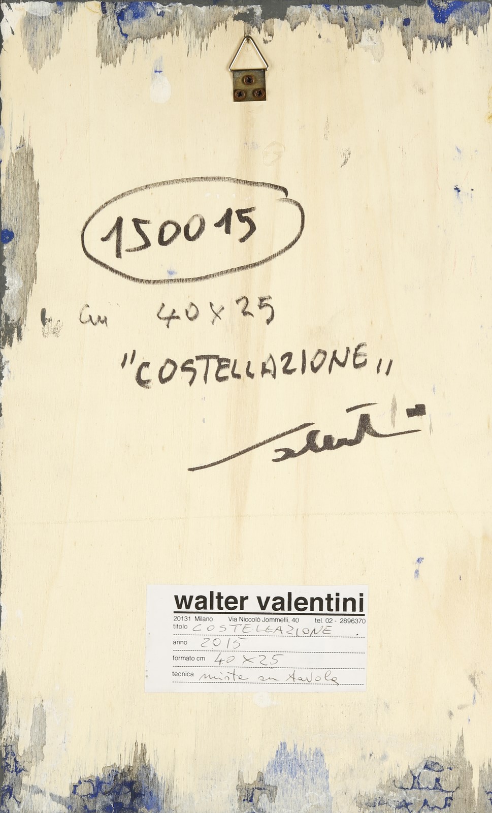 VALENTINI WALTER (n. 1928) Costellazione. 2015. Tecnica mista su tavola. Cm 25,00 x 40,00. Al retro titolo, firma e cartiglio descrittivo dell'artista. Entro teca di plexiglass. Cornice presente