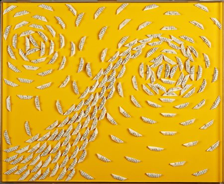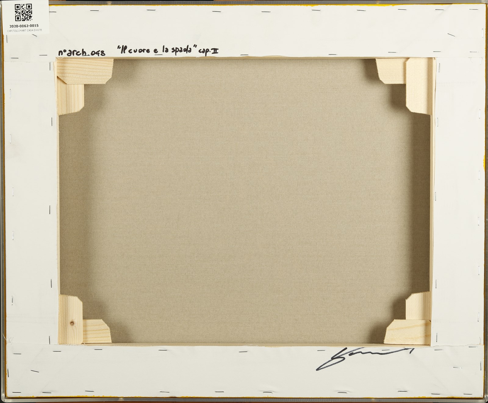 GUSMAROLI RICCARDO (n. 1963) Il cuore e la spada cap.2. 2019. Tecnica mista e applicazioni su tela. Cm 55,00 x 45,00. Al retro titolo e firma. Opera archiviata presso l'Archivio Gusmaroli come da documentazione fotografica allegata all'opera riportante il relativo numero d'inventario. Entro teca di plexiglass. Cornice presente
