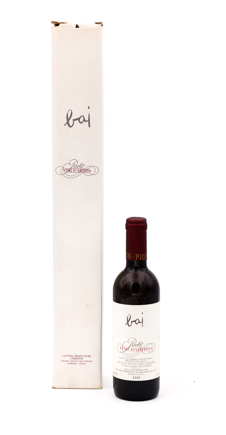 Confezione cartonata contenente un vino Picolit dell'Azienda Produttori Cormons e un manifesto tratto da un'opera di Enrico Baj, recante firma a pennarello dell'Artista al fronte