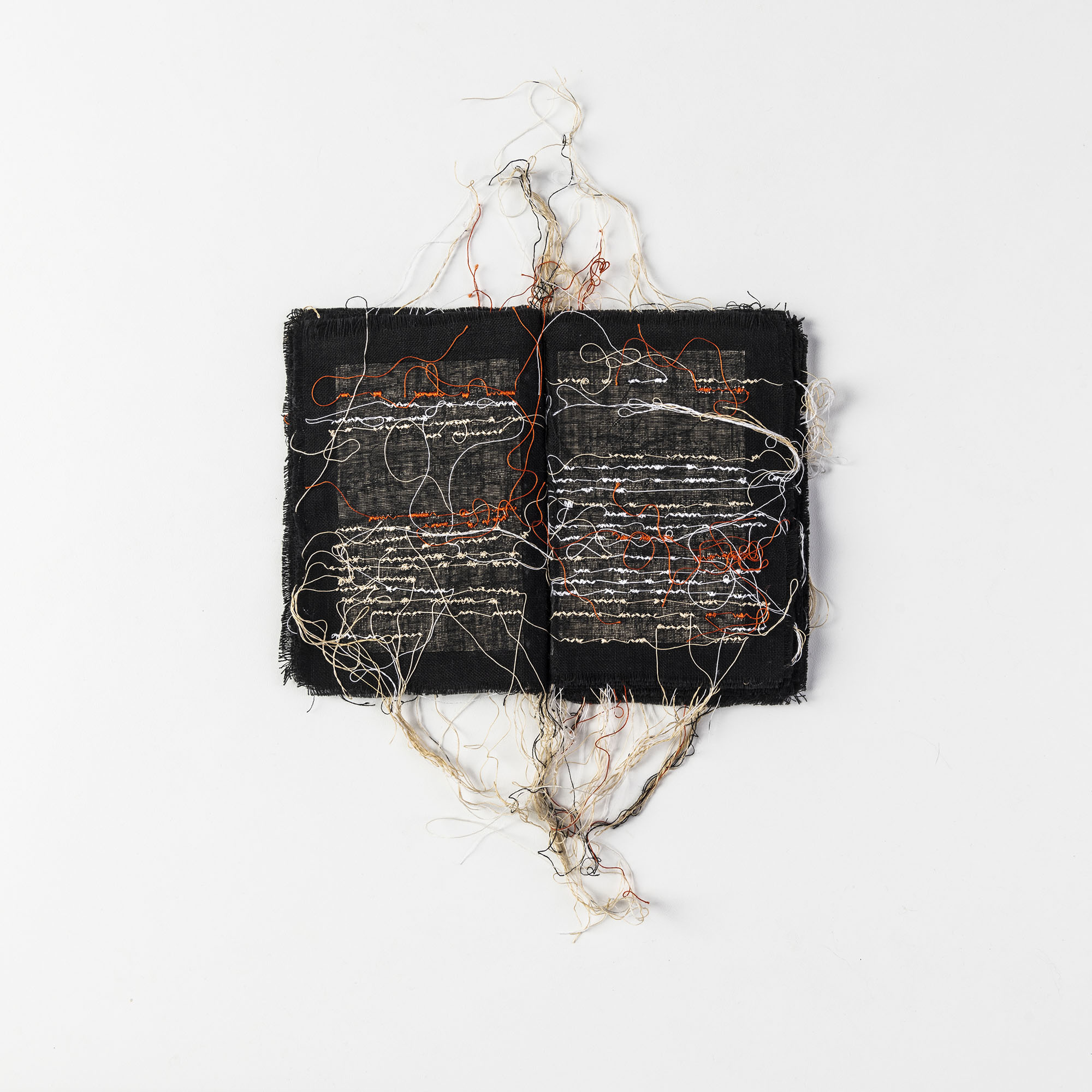Assemblaggio di tessuto e xerografie ricamate con filo, cm. 15 x 20 (dimensioni libro aperto)