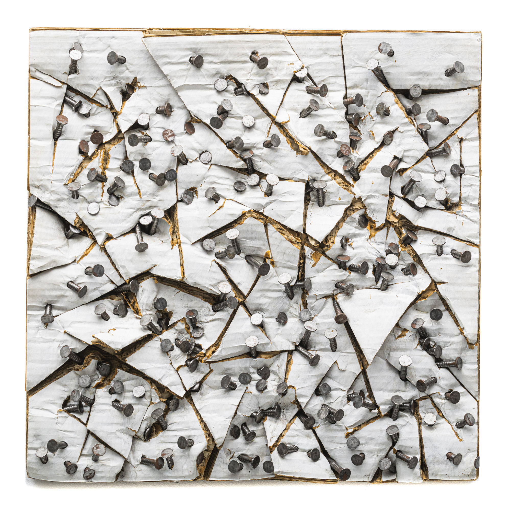 Chiodi e pittura spray su cartoni intagliati sovrapposti, cm. 40 x 40 x 5
