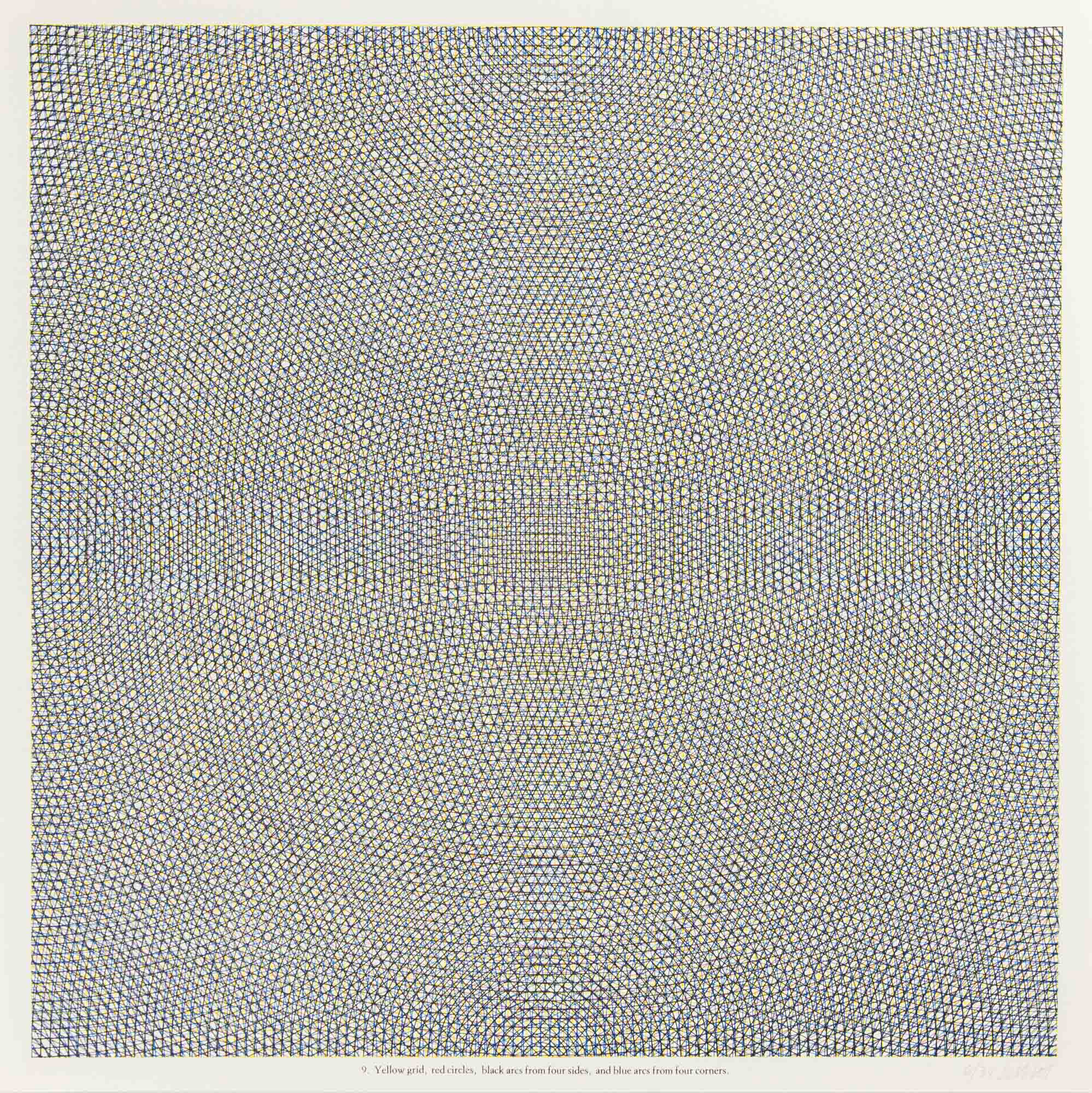 SOL LEWITT Yellow grid, red circles, black arcs from four sides, and blue arcs from four corners, 1972