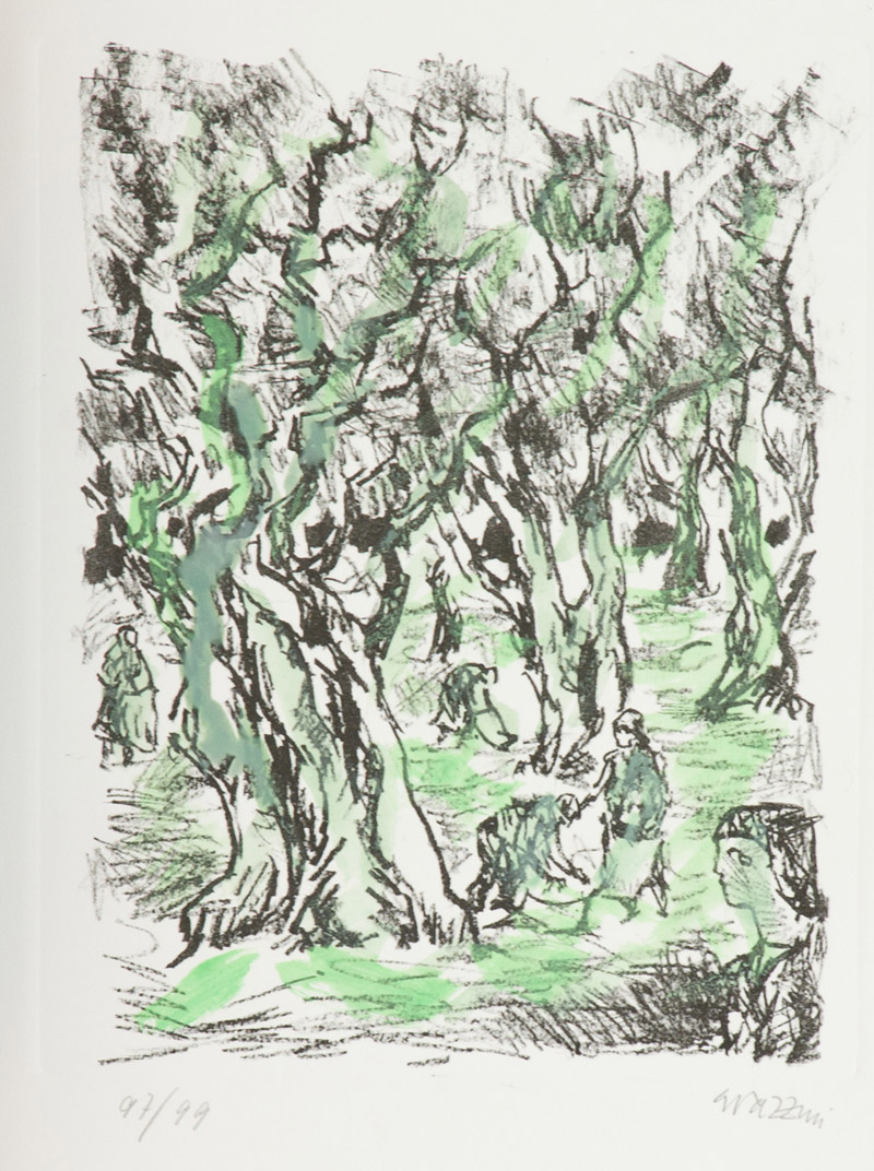 Renzo Grazzini Raccolta delle olive Litografia colorata a mano su carta, cm....