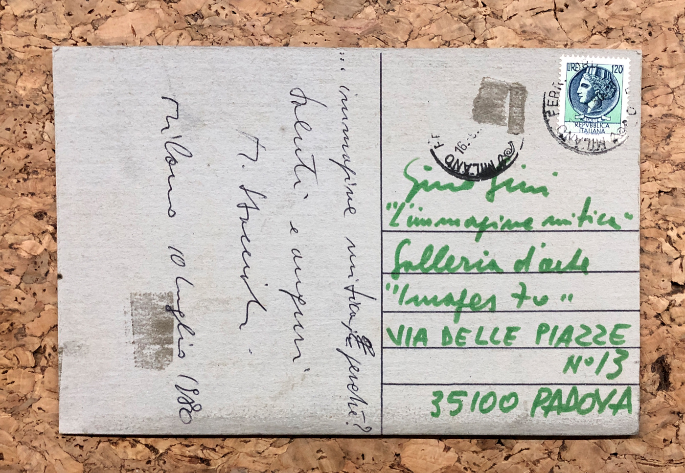 Opere di mail art indirizzata a Gino Gini, curatore della collettiva di 'Mail Art' tenutasi presso Galleria Mastrogiacomo - Images 70, Padova, dal 27/09/1980 al 24/10/1980