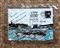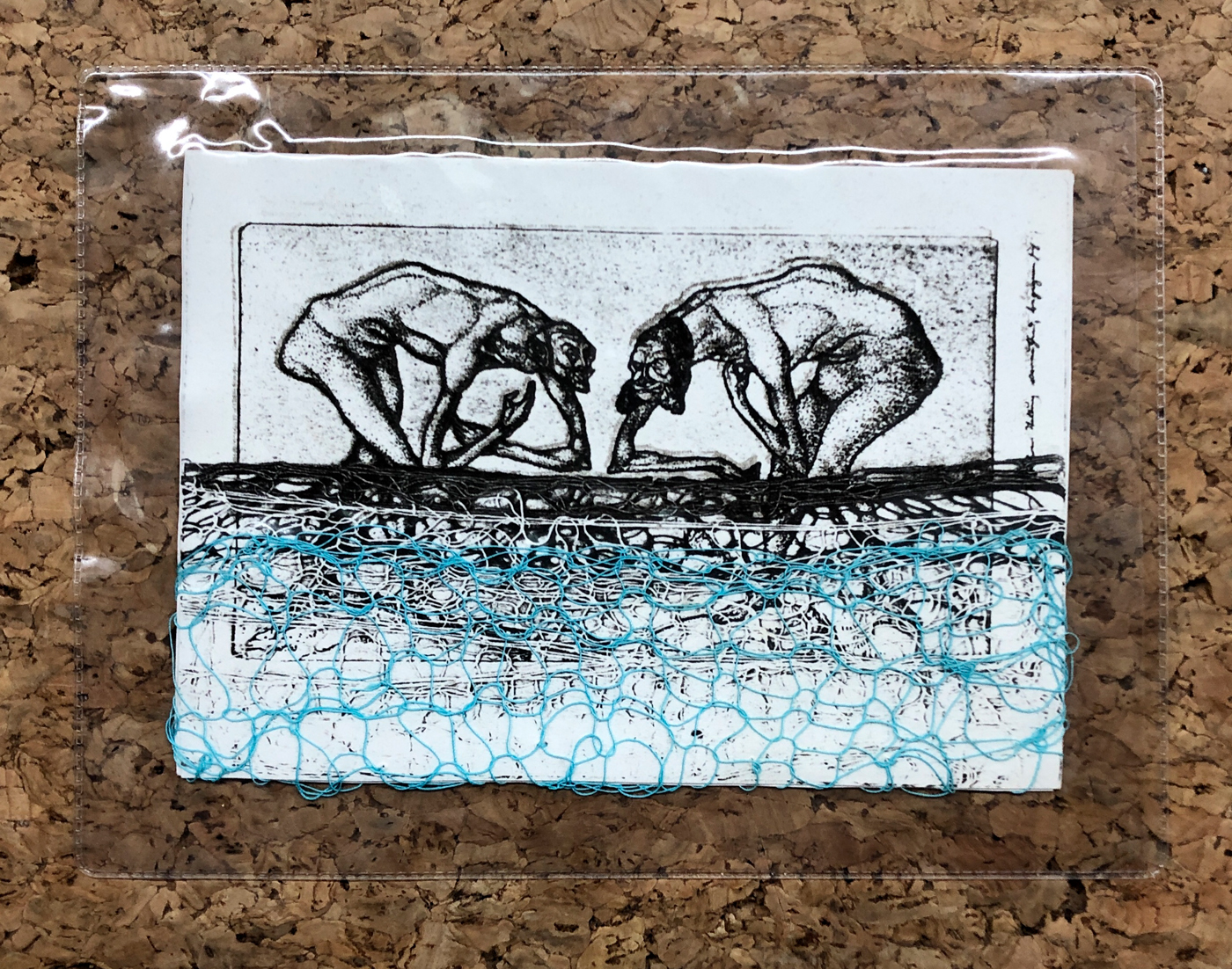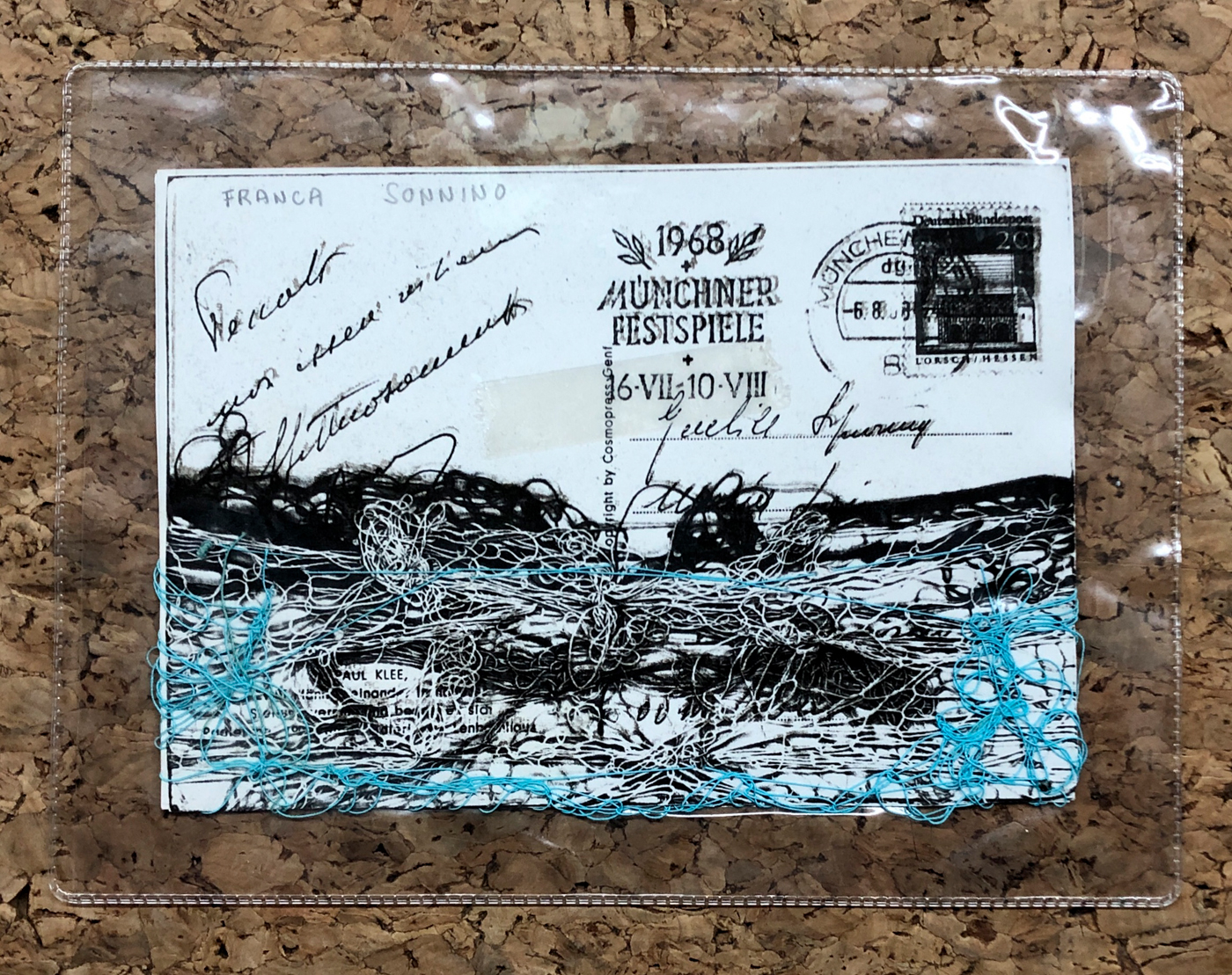 Tecnica mista e cuciture di filo azzurro su carta entro busta di plastica