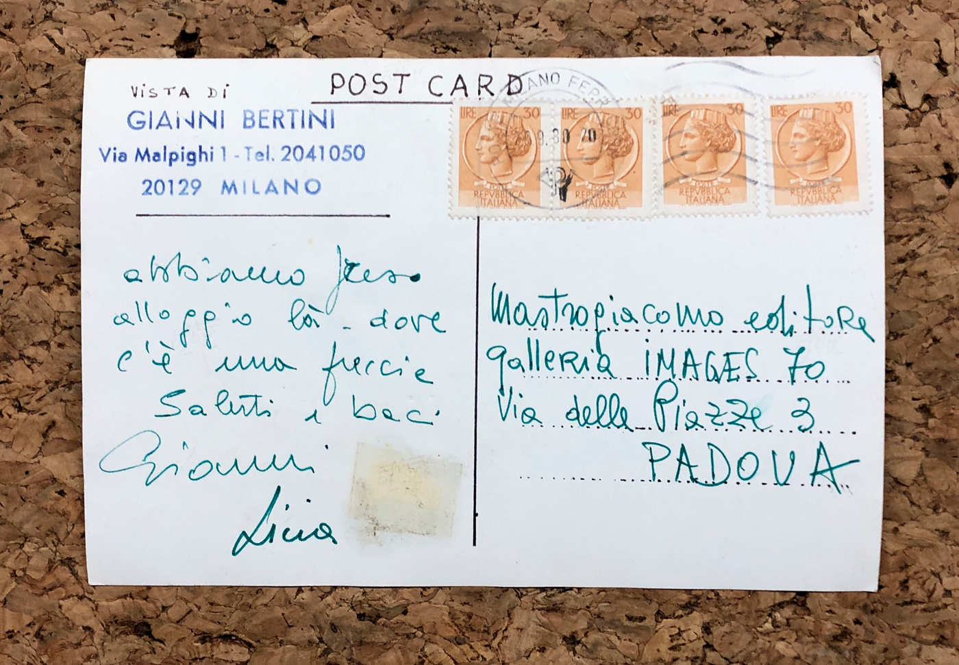Opere di mail art indirizzata a Gino Gini, curatore della collettiva di 'Mail Art' tenutasi presso Galleria Mastrogiacomo - Images 70, Padova, dal 27/09/1980 al 24/10/1980