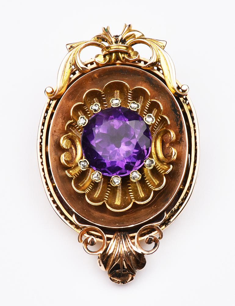 Lot 10 | SPILLA IN ORO GIALLO 18 K CON AMETISTA E PICCOLI BRILLANTI, AL RETRO...