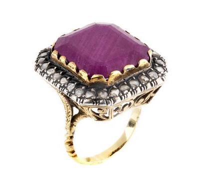 montatura in oro traforato e cesellato a volute, al centro un rubino taglio ottagonale sfaccettato di mm 17,7x16,2x3,3 circa entro cornice in argento e rose di diamanti