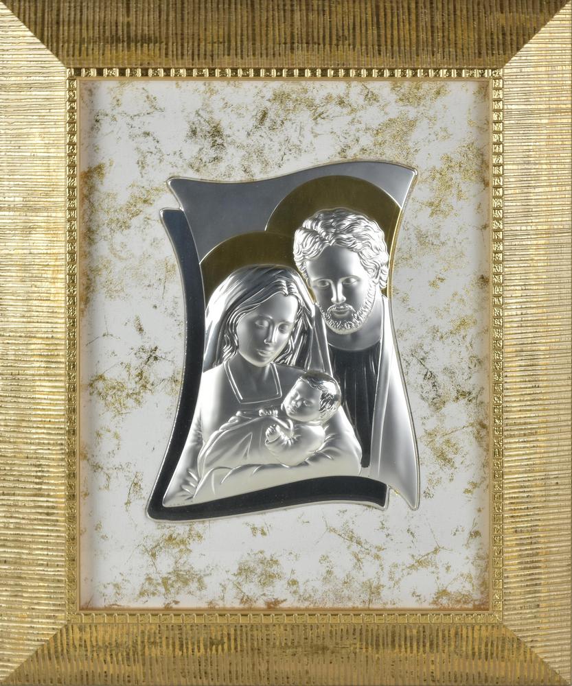 satinata, lucida e dorata raffigurante la Sacra Famiglia, entro cornice in legno scolpita e dorata