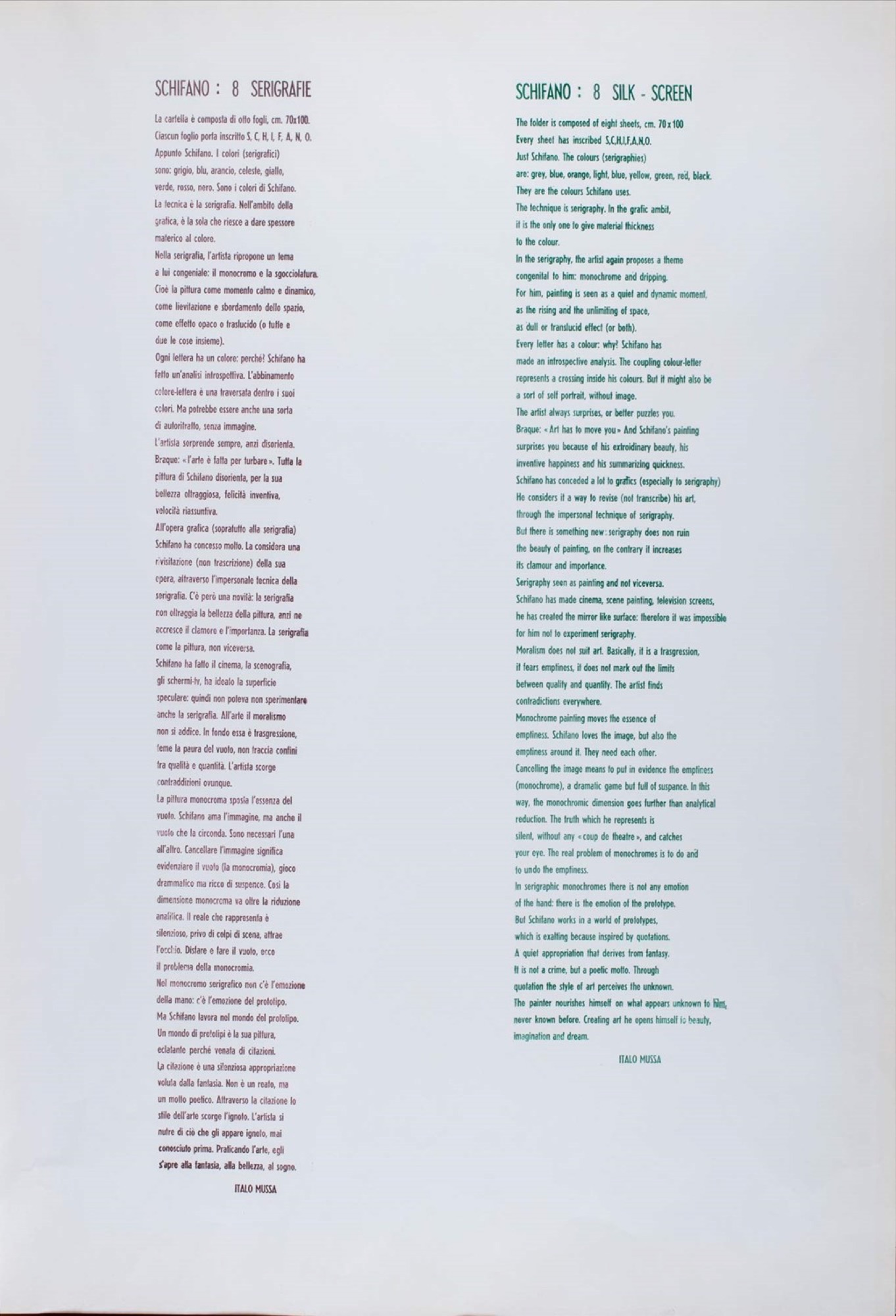 cartella contenente 8 serigrafie a colori, ess. 28/90 (dalla tiratura di 90 esemplari in numeri arabi e XXX esemplari in numeri romani) con testo di Italo Mussa