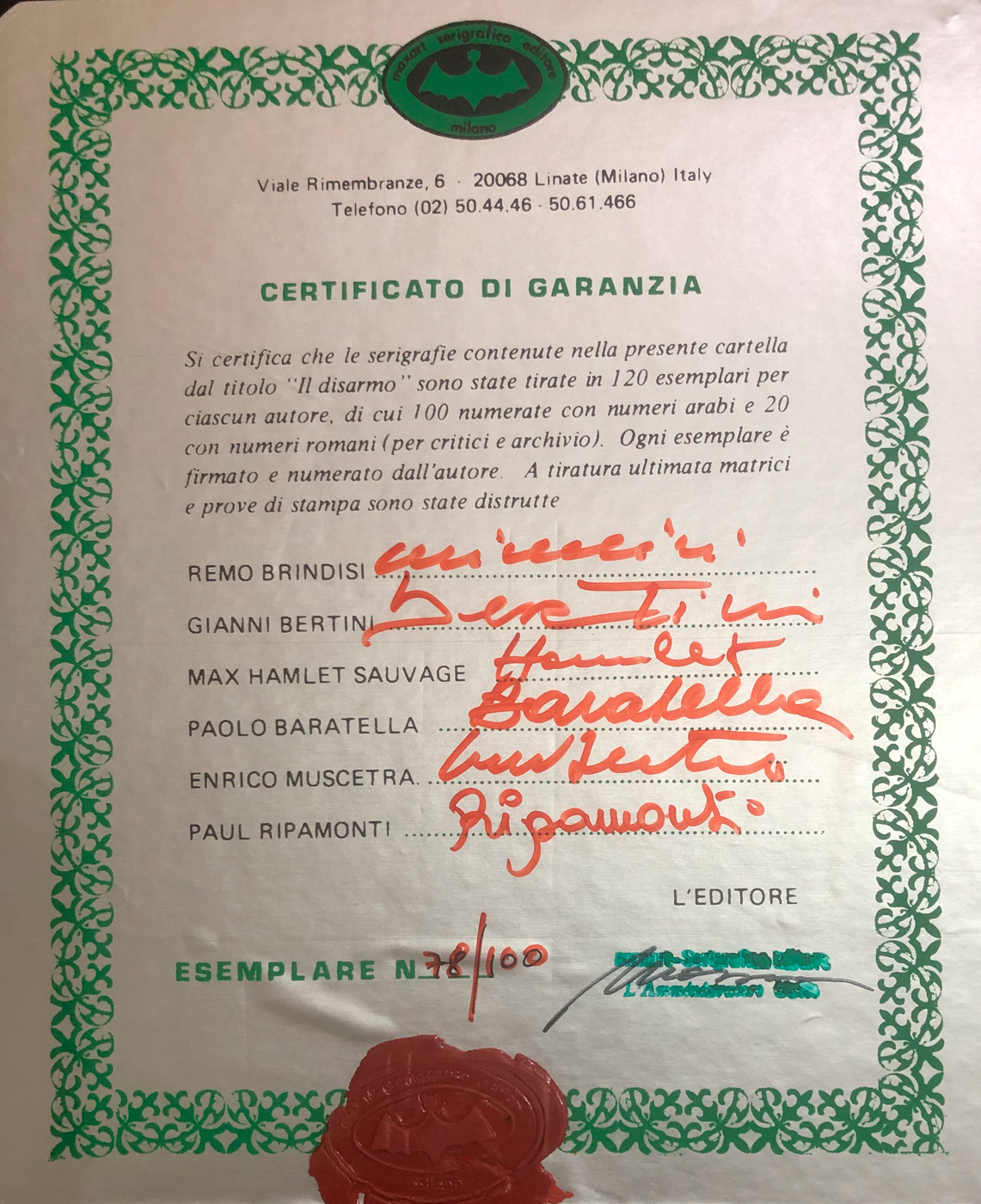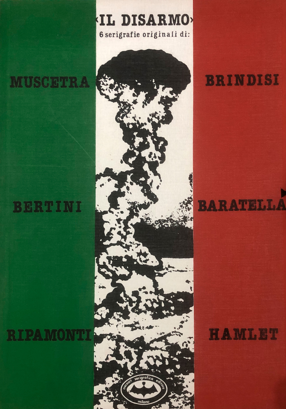 Cartella contenente testo di presentazione di Carlo Munari e 6 serigrafie originali di Enrico Muscetra, Paul Ripamonti, Paolo Baratella, Remo Brindisi, Gianni Bertini e Max Hamlet, ciascuna recante firma, numerazione (Esemplari 78/100) a matita al fronte e timbro a secco dell'Editore