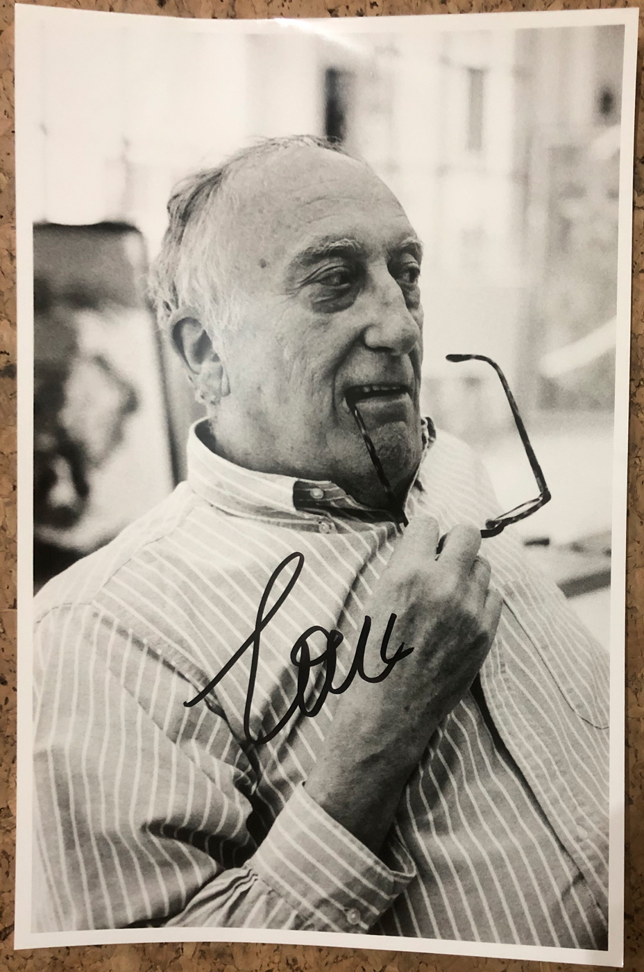 Stampa fotografica in bianco e nero ritraente l'artista e recante firma a pennarello al fronte e etichetta dell'Agenzia Foto-giornalistica Studio Nord al retro