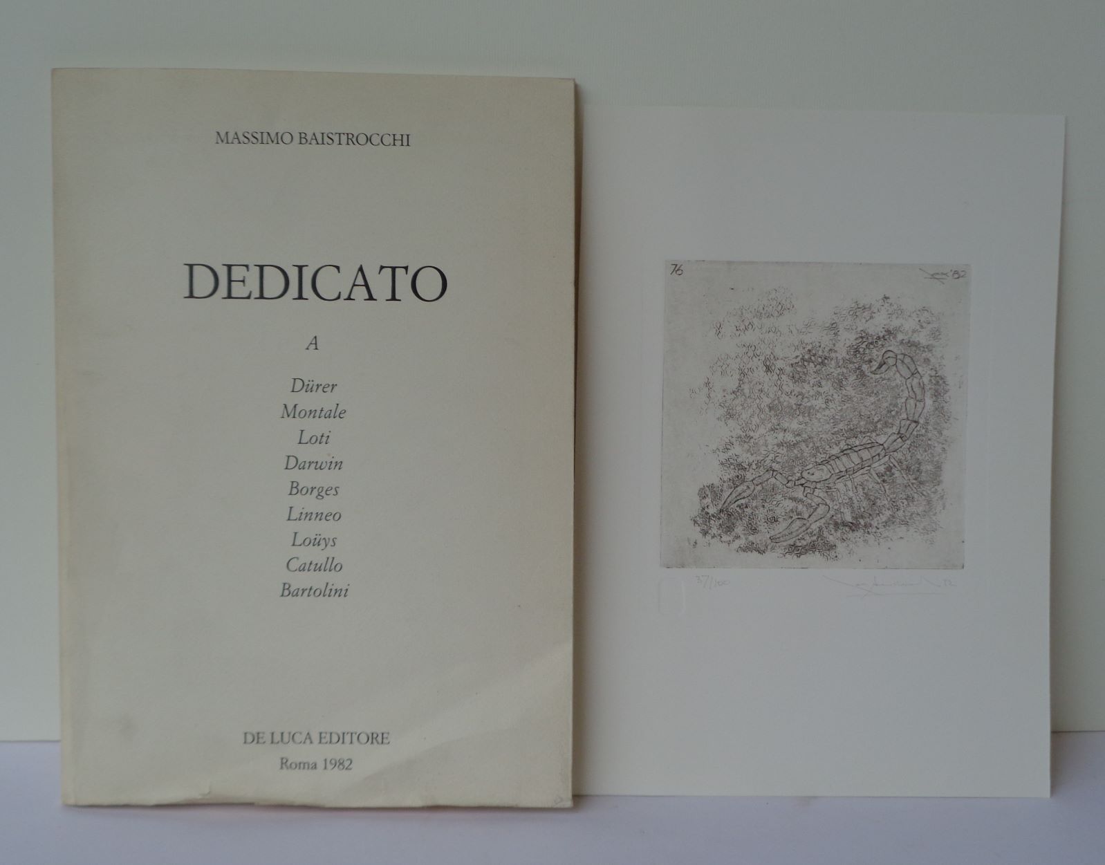 Massimo Baistrocchi Dedicato a…, 1982 Dürer, Montale, Loti, Darwin, Borges, Linneo, Loüys, Catullo, Bartolini. 34 x 24 cm., De Luca editore, Roma 1982. Di questa edizione sono stati stampati cento esemplari su carta acquarello, ciascuno con quattro acqueforti originali stampate su carta Ventura, firmate e numerate dall’autore da I a X e da 11 a 100. Il nostro nr. 37